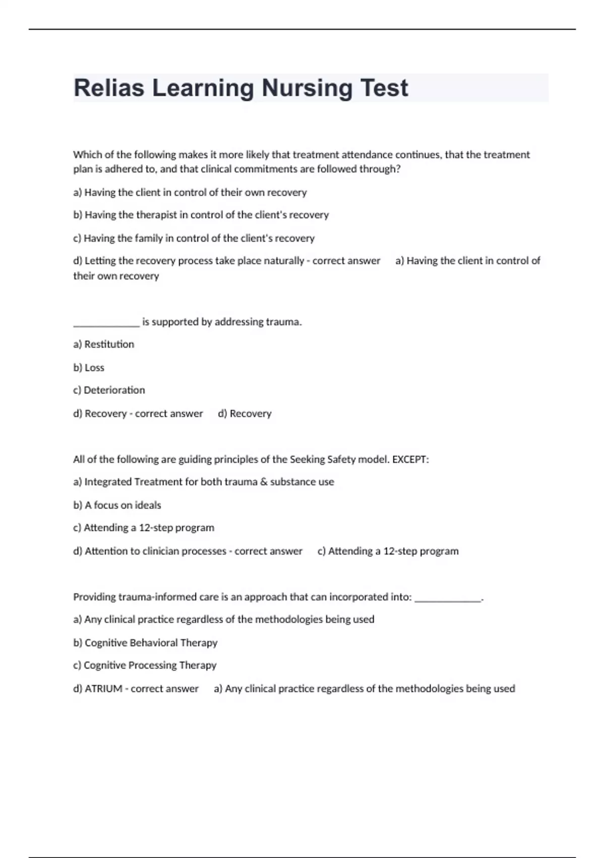 Which of the following makes it more likely that treatment attendance continues, that the treatment plan is adhered to, and that clinical commitments are followed through? a) Having the client in control of their own recovery b) Having the therapist in control of the client's recovery c) Having the family in control of the client's recovery d) Letting the recovery process take place naturally - correct answer a) Having the client in control of their own recovery ____________ is supported by addressing trauma. a) Restitution b) Loss c) Deterioration d) Recovery - correct answer d) Recovery All of the following are guiding principles of the Seeking Safety model. EXCEPT: a) Integrated Treatment for both trauma & substance use b) A focus on ideals c) Attending a 12-step program d) Attention to clinician processes - correct answer c) Attending a 12-step program Providing trauma-informed care is an approach that can incorporated into: ____________. a) Any clinical practice regardless of the methodologies being used b) Cognitive Behavioral Therapy c) Cognitive Processing Therapy d) ATRIUM - correct answer a) Any clinical practice regardless of the methodologies being used Intrusion and re-experiencing symptoms of PTSD include ____________. a) Avoidance of distressing trauma reminders b) Distressing memories, dreams, or flashbacks surrounding the trauma c) Restricted affect and distorted cognitions d) Hypervigilance and exaggerated startle reactions - correct answer b) Distressing memories, dreams, or flashbacks surrounding the trauma Inability to remember certain aspects of the trauma, presenting with a restricted affect, and exhibiting distorted cognitions are aspects of which PTSD symptom cluster? a) Avoidance of distressing trauma reminders b) Intrusion symptoms c) Negative alterations in cognitions and mood d) Arousal and reactivity - correct answer c) Negative alterations in cognitions and mood When is it most important that the person served feels that the environment is a safe place where they can discuss details of their trauma? a) In outpatient settings b) In residential treatment facilities c) In and inpatient setting d) In all settings - correct answer d) In all settings One of the primary goals for treatment in the Seeking Safety model is: a) Stopping self-harm b) Ending substance use once and for all c) Gaining control over minor symptoms d) Maintaining relationships - correct answer a) Stopping self-harm True or False: If a person develops resiliency through their childhood and life experiences, the effect of any genetic risks for substance use disorder are greatly increased. a) True b) False - correct answer b) False True or False: Trauma increases the the risk of developing substance use problems, while substance use problems increase the likelihood that people will experience trauma. a) True b) False - correct answer a) True Repeated use of substances trains the brain's circuits to depend on substances to trigger ____________. a) False positives b) False negatives c) Reward circuitry d) Biofeedback - correct answer c) Reward circuitry True or False: Those who had experienced traumatic physical or sexual abuse, or assault, were three times more likely to report substance use disorder than those without trauma. a) True b) False - correct answer a) True Motivational interviewing is an opportunity for: a) The therapist to assess for themselves if the benefits of using a specific therapeutic approach b) Clients to assess for themselves the benefits of their specific choices c) Self-improvement as it relates to substance use disorders d) Self-improvement as it relates to posttraumatic stress disorder - correct answer b) Clients to assess for themselves the benefits of their specific choice Which of the following is essential in any formal treatment setting for bringing hope, encouragement, and clinical skill to the interaction? a) Believing that people can and do recover from mental illnesses like anxiety, traumatic stress, and substance use b) Telling clients that you believe in their recovery even if you don't c) Level of education and formal training that you offer d) Offering communication surrounding cultural norms and expectations about recovery, along with where they can strengthen their skills to meet these expectations - correct answer a) Believing that people can and do recover from mental illnesses like anxiety, traumatic stress, and substance use To understand an individual's response to life stressors by misusing substances, becoming preoccupied, and persisting in their use despite increasing consequences, be sure to assess any underlying a) Financial hardships b) Employment problems c) Biopsychosocial factors d) Health problems - correct answer c) Biopsychosocial factors Assessing for substance use disorder ideally should include all of the following, EXCEPT: a) Initial screening for drugs and alcohol b) Potentially threatening, intrusive questions that ask the difficult questions about personal habits c) Screening for behavioral health problems d) Screening for cognitive functioning - correct answer b) Potentially threatening, intrusive questions that ask the difficult questions about personal habits One of the first principles of trauma-informed care is understanding ____________. a) Clinical practice principles b) Tr