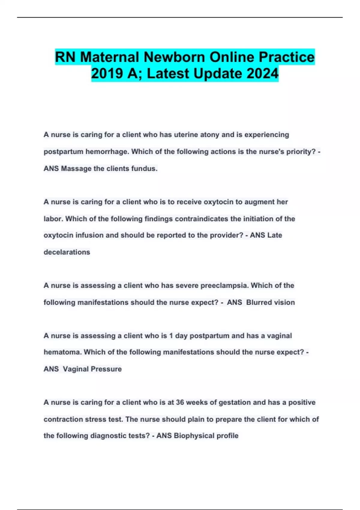 RN Maternal Newborn Online Practice 2019 A; Latest Update 2024