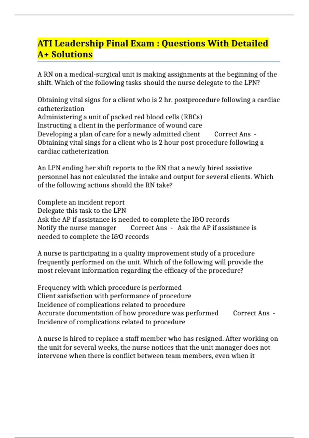 ATI Leadership Final Exam : Questions With Detailed A+ Solutions