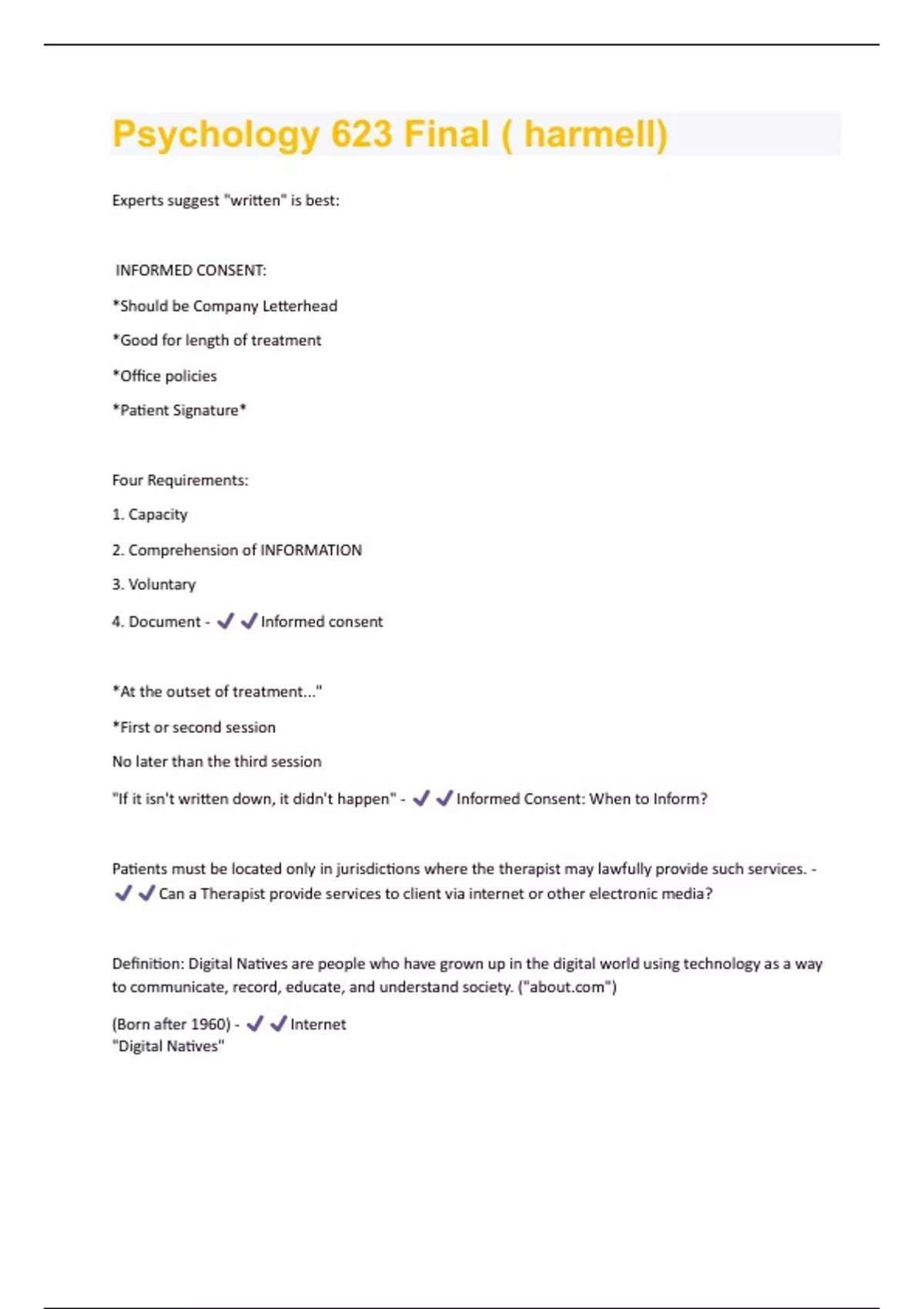 Experts suggest "written" is best: INFORMED CONSENT: *Should be Company Letterhead *Good for length of treatment *Office policies *Patient Signature* Four Requirements: 1. Capacity 2. Comprehension of INFORMATION 3. Voluntary 4. Document - Informed consent *At the outset of treatment..." *First or second session No later than the third session "If it isn't written down, it didn't happen" - Informed Consent: When to Inform? Patients must be located only in jurisdictions where the therapist may lawfully provide such services. - Can a Therapist provide services to client via internet or other electronic media? Definition: Digital Natives are people who have grown up in the digital world using technology as a way to communicate, record, educate, and understand society. ("") (Born after 1960) - Internet "Digital Natives"*There must be an authorization by the client previously obtained in writing to disclose any confidential information. *When the possibility exists that others, including family members, may obtain access to such information, this possibility, together with the plan for protecting confidentiality, is explained LIMITS: Limits of Confidentiality: Sessions between a psychologist and patient are strictly confidential, except under certain legally defined situations involving threats of self-harm or harm to another, and situations of child abuse, elder abuse, or abuse of otherwise dependent individuals. In the case of: danger to others, I am required by law to notify the police and to inform any intended victim(s). In the case of :self-harm, I am ethically bound to inform the nearest relative, significant other, or to otherwise enlist methods to prevent self-harm or suicide. In instances of: child abuse, elder abus - Confidentiality When a child tells a mandated reporter of abuse, the communication is NOT privileged... the individual, BY LAW, must report what the child has related." * If a child informs therapist of abuse that he/she is witnessed too. You are MANDATED to report under EMOTIONAL ABUSE. Divorce - Dissolution Plaintiff - Petitioner Defendant - Respondent Alimony- Spousal Support - Family law terminology