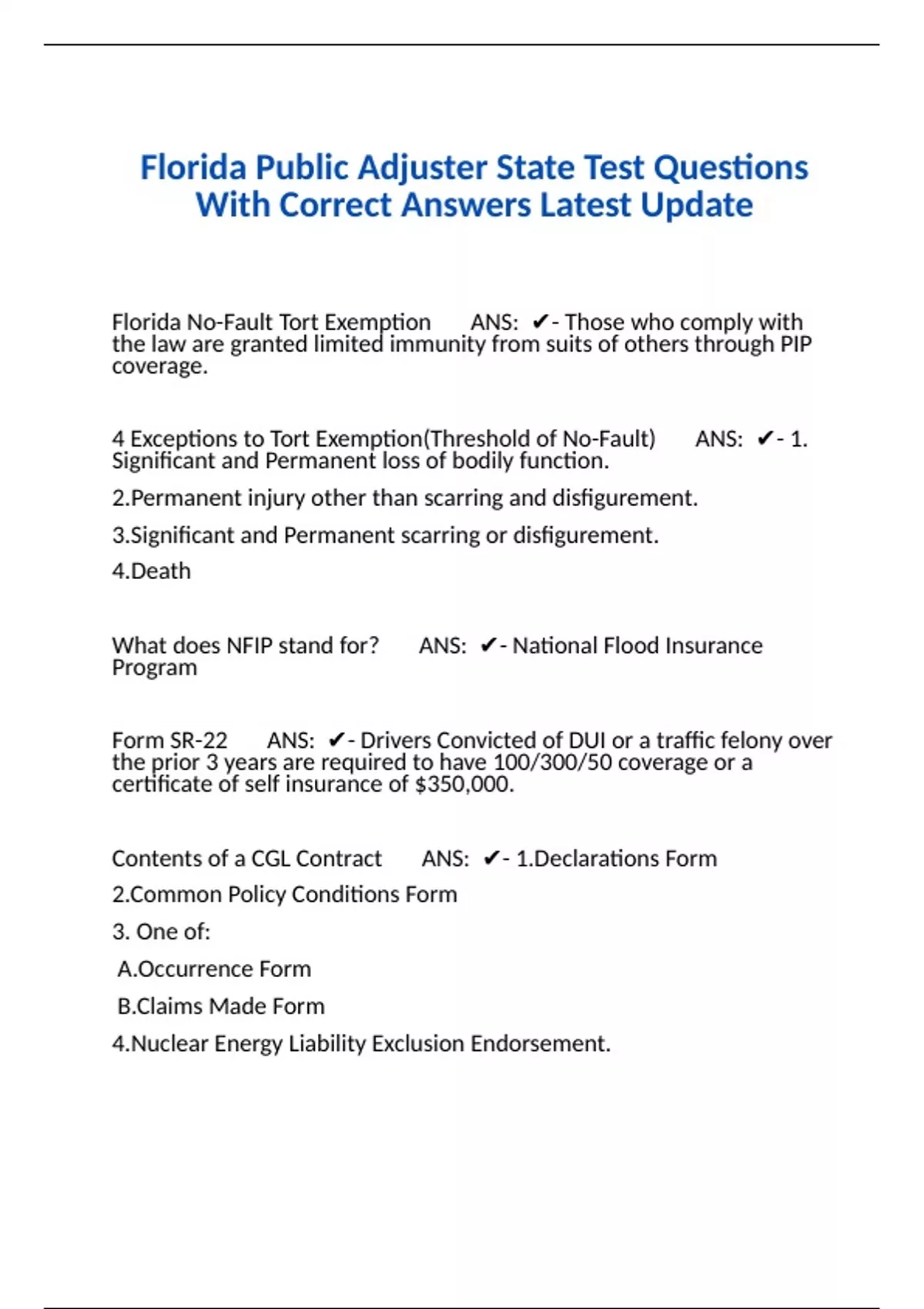 Florida Public Adjuster State Test Questions With Correct Answers Latest Update Florida No-Fault Tort Exemption ANS: - Those who comply with the law are granted limited immunity from suits of others through PIP coverage. 4 Exceptions to Tort Exemption(Threshold of No-Fault) ANS: - 1. Significant and Permanent loss of bodily function. 2.Permanent injury other than scarring and disfigurement. 3.Significant and Permanent scarring or disfigurement. 4.Death What does NFIP stand for? ANS: - National Flood Insurance Program Form SR-22 ANS: - Drivers Convicted of DUI or a traffic felony over the prior 3 years are required to have 100/300/50 coverage or a certificate of self insurance of $350,000. Contents of a CGL Contract ANS: - 1.Declarations Form 2.Common Policy Conditions Form 3. One of: A.Occurrence Form B.Claims Made Form 4.Nuclear Energy Liability Exclusion Endorsement. Declarations of a CGL Contract(4) ANS: - 1.Named Insured(including address) 2.Policy Period 3.Premium 4.Limits of Coverage