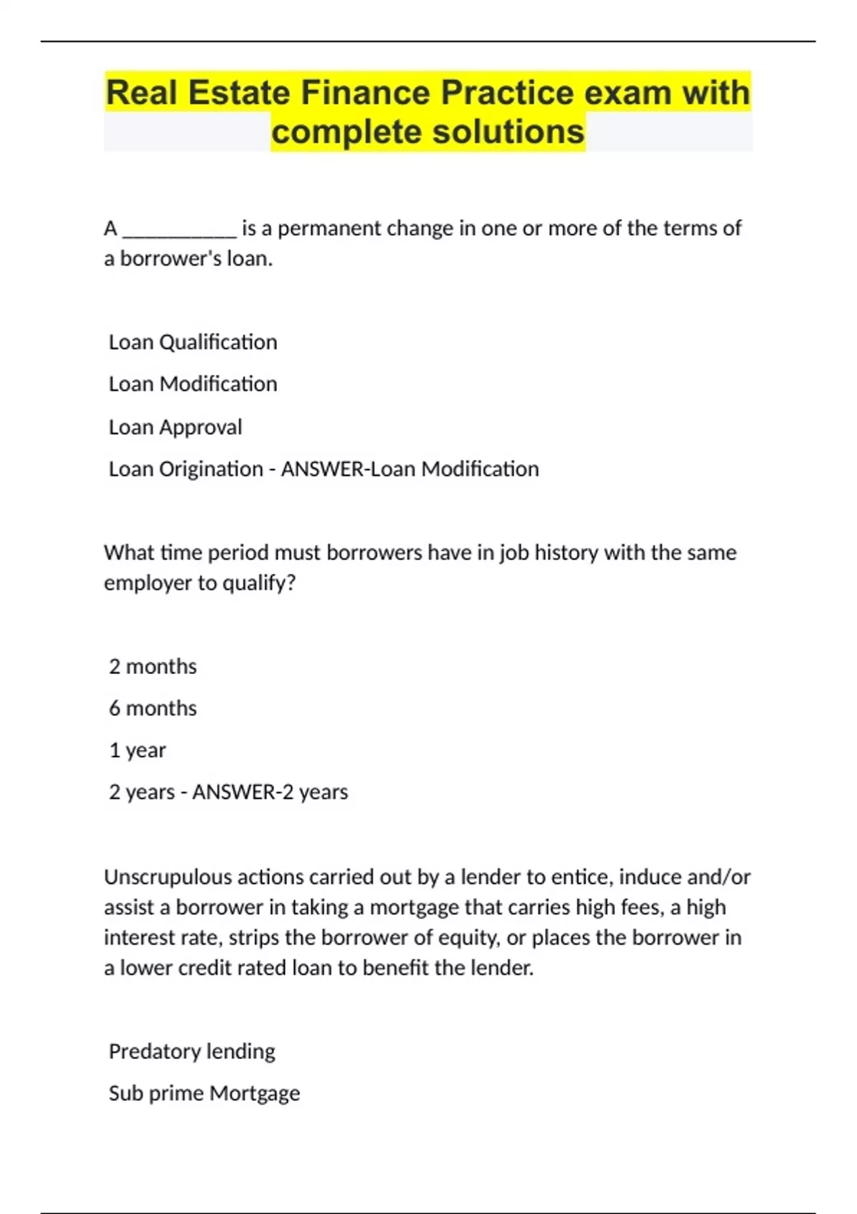 A __________ is a permanent change in one or more of the terms of a borrower's loan. Loan Qualification Loan Modification Loan Approval Loan Origination - ANSWER-Loan Modification What time period must borrowers have in job history with the same employer to qualify? 2 months 6 months 1 year 2 years - ANSWER-2 years Unscrupulous actions carried out by a lender to entice, induce and/or assist a borrower in taking a mortgage that carries high fees, a high interest rate, strips the borrower of equity, or places the borrower in a lower credit rated loan to benefit the lender. Predatory lending Sub prime Mortgage Participation Agreement Fraud - ANSWER-Predatory lending Why do lender care about unpaid taxes? They want to ensure your mortgage payment is not late It makes the loan difficult to sell in the secondary market Unpaid property taxes are a superior lien to the right of the lender Lenders don't care about unpaid taxes - ANSWER-Unpaid property taxes are a superior lien to the right of the lender A burden, obstruction, or impediment on the property that lessens its value or makes it less marketable. Lien Interest Encumbrance Mortgage - ANSWER-Encumbrance Which party is not included on the deed of trust? Mortgagor Mortgagee Trustor Trustee - ANSWER-Trustor The mortgage or deed of trust will contain ___________ that permits the lender to demand that the entire balance of the loan be repaid if the borrower defaults. Due on sale clause Acceleration clause Alienation clause Balloon clause - ANSWER-Acceleration clause One of the largest buyers of securities is _________. Credit Unions Pension Funds China American Public - ANSWER-Pension Funds A company or individual that originates mortgage loans and sells them to investors, while taking care of borrowers loan payments, records, taxes, and insurance. Mortgage Bankers Mortgage Brokers Loan Originators Secondary Market - ANSWER-Mortgage Bankers The largest buyer of residential mortgages in the United States today. FHLMC GNMA Banks FNMA - ANSWER-FNMA Provides cash advances to members, including community banks, thrifts, credit unions and community development financial institutions. FNMA FHLMC FHLB Banks - ANSWER-FNMA Loan amount is $337,500. Down payment is $37,500. What is the LTV? 10% 11% 90% 91% - ANSWER-90% The market where borrowers and mortgage originators come together to negotiate terms and effectuate mortgage transactions. Money market Primary market Secondary market Origination market - ANSWER-Primary market A collaboration among lenders to share in a loan too big to handle for any one of them. Participation loan Collaboration loan Shared loan Co-Operation loan Next question - ANSWER-Participation loan The lender or the mortgage broker must provide a GFE within ____________ of receiving the application or other required information. 24 hours 3 days One business day 3 business days - ANSWER-3 business days A ___________ is a form that lists basic information about the terms of a mortgage loan for which the consumer applied. HUD-1 Deed of Trust Closing Statement GFE - ANSWER-GFE _____________ serves as a financial and administration resources that helps provide essential services and affordable housing opportunities to Texans who qualify for this assistance based on their income level. USDA FHA TDHCA CFPB - ANSWER-TDHCA The Safe and Fair Enforcement for Mortgage Licensing Act (SAFE Act) has been transferred to the ____________ for administration and enforcement. APA CFPB RESPA FHA - ANSWER-CFPB ___________ is about closing costs and settlement procedures. TILA RESPA SAFE Regulation Z - ANSWER-RESPA Sales price is$475,000. LTV is 90%. Tax rate is $1.97/$100. closing is July 17th. Using a banker's year, prorate the taxes. Assume no leap year. Credit the buyer $5120.03 Debit the seller $4608.57 Credit the buyer $4631.22 Debit the seller $5146.02 - ANSWER-Credit the buyer $5120.03 The purpose of __________ is to promote the informed use of consumer credit by requiring disclosures about its terms and cost. TILA RESPA SAFE HUD-1 - ANSWER-TILA The ___________ is intended to encourage depository institutions to help meet the credit needs of the communities in which they operate. Redline TILA CRA Fair Credit Act - ANSWER-CRA A current medium of exchange collectively in the form of coins and banknotes. Trusts Securities Money Bonds - ANSWER-Money In the United States, money is controlled by the ____________. Congress Wall Street Banks The Federal Reserve - ANSWER-The Federal Reserve _______________ are the amount of funds that a depository institution must hold in reserve against specified deposit liabilities. FDIC Reserve requirements Discount requirements None of the above - ANSWER-Reserve requirements Sale price is $323,500 and the LTV is 85%. Closing date is June 27th. Using an actual year, calculate the monthly PMI factor is .0033 $88.96 $75.62 $63.95 $92.30 - ANSWER-$75.62 The evidence of indebtedness. Credit instrument Lien Debt Promise - ANSWER-Credit instrument All of the following are functions of the department of Treasury EXCEPT: Managing Federal finances Currency and coinage Determining national debt Enforcing Federal finance and tax laws - ANSWER-Determining national debt Major responsibilities of the Mint include all of the following EXCEPT: Manufacturing and selling platinum, gold and silver bullion coins Distributing U.S. coins to the Federal Reserve banks and branches Receiving, redeeming and processing mutilated coins Education for collectors on rare coins - ANSWER-Education for collectors on rare coins Federal Home Loan Banks are cooperatives. True False - ANSWER-True Insurance is $2800/year. Sales price $437,500. LTV is 95%. Insurance start date is December 5th. Close date is August 13th. Using a banker's year, calculate the monthly insurance payment. Assume no leap year. $7.78 $233.33 $255.00 $1983.90 - ANSWER-$233.33 The science that describes the management, creation and study of money, banking, credit, investments assets and