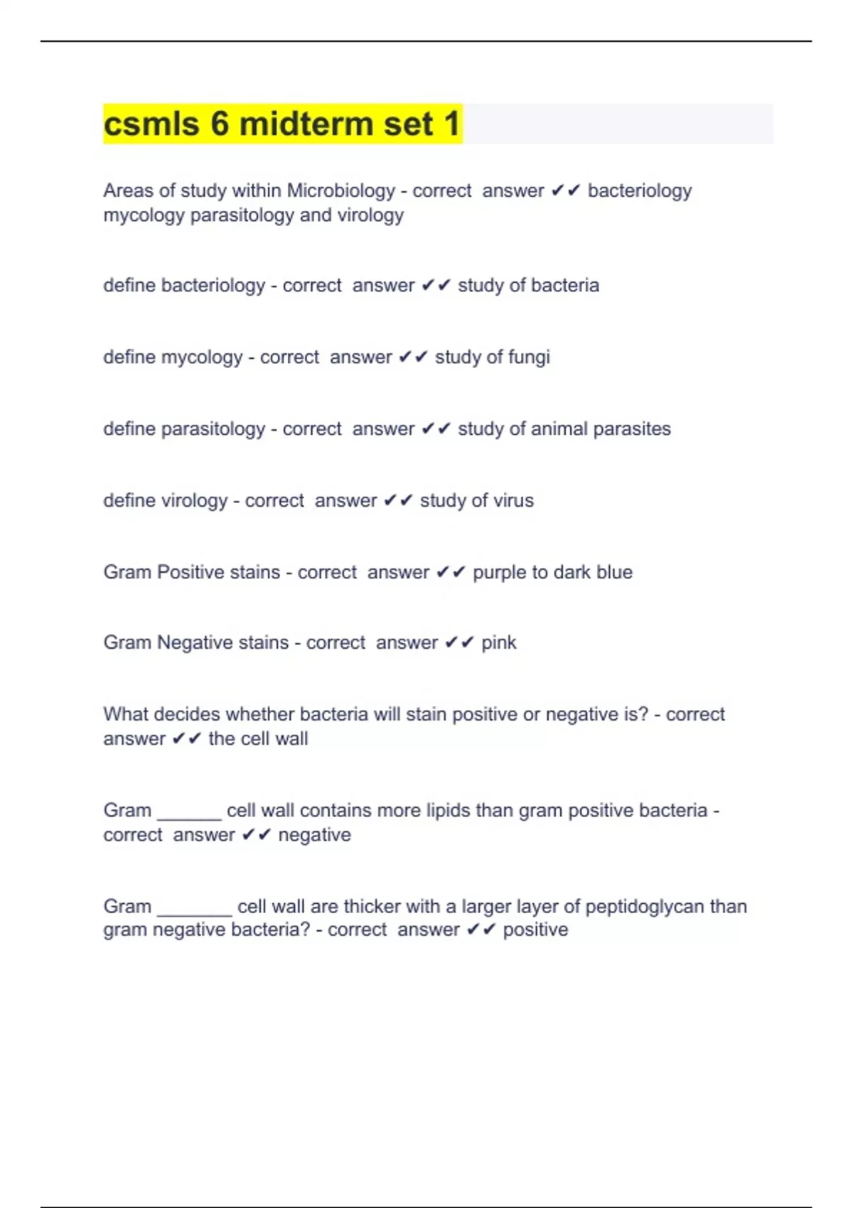 csmls 6 midterm set 1 Question and answers verified to pass csmls 6 midterm set 1 Areas of study within Microbiology - correct answer bacteriology mycology parasitology and virology define bacteriology - correct answer study of bacteria define mycology - correct answer study of fungi define parasitology - correct answer study of animal parasites define virology - correct answer study of virus Gram Positive stains - correct answer purple to dark blue Gram Negative stains - correct answer pink What decides whether bacteria will stain positive or negative is? - correct answer the cell wall Gram ______ cell wall contains more lipids than gram positive bacteria - correct answer negative Gram _______ cell wall are thicker with a larger layer of peptidoglycan than gram negative bacteria? -