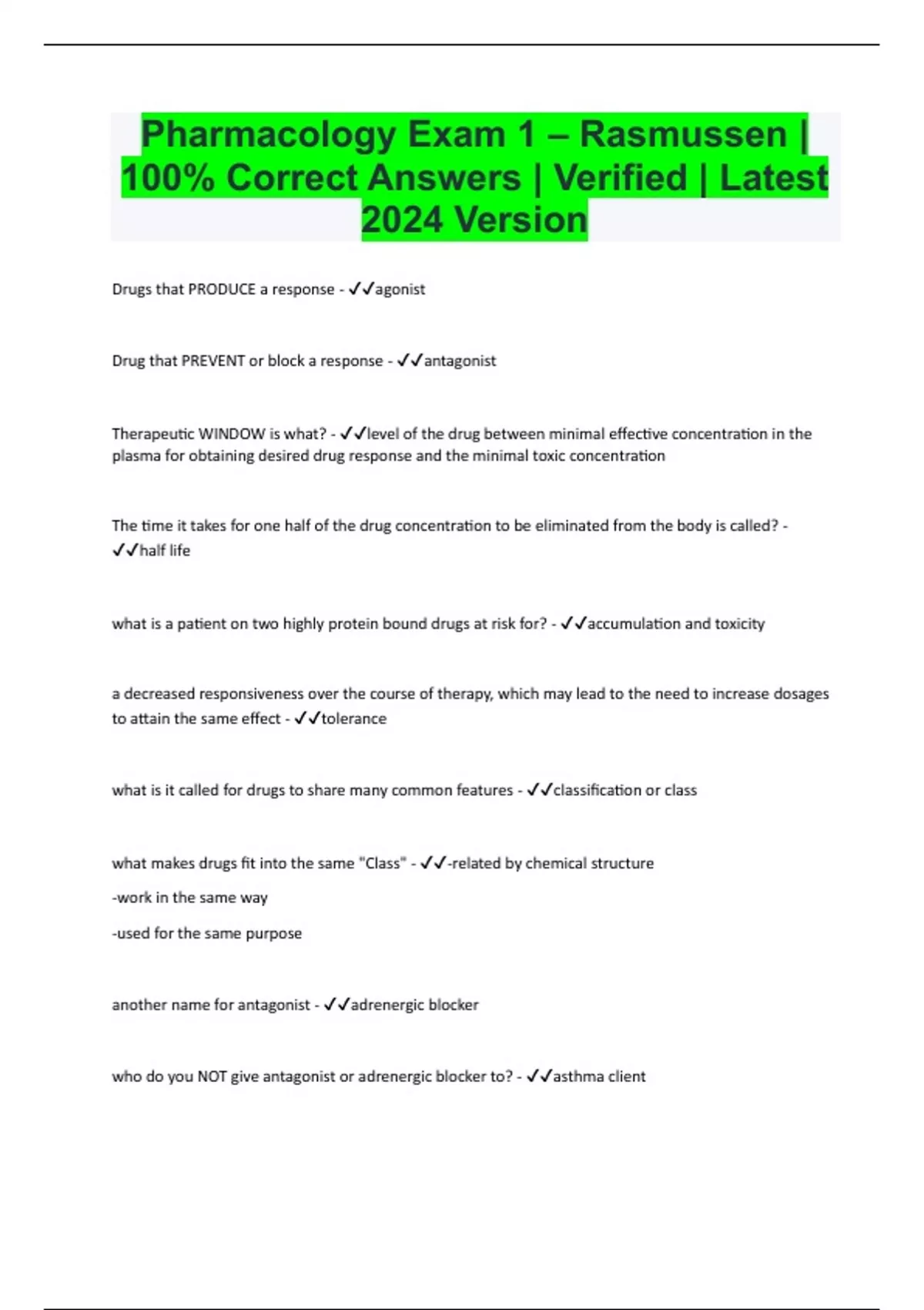 Pharmacology Exam 1 – Rasmussen | 100% Correct Answers | Verified | Latest 2024 Version