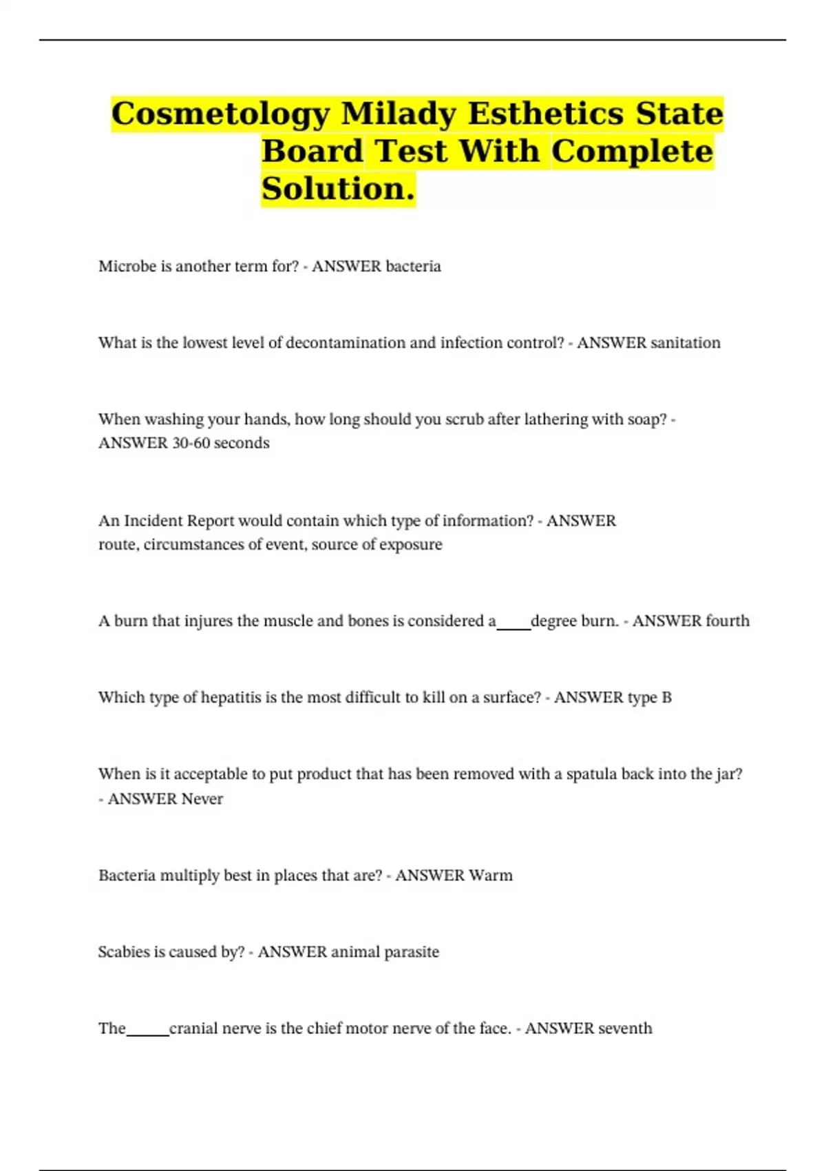 Microbe is another term for? - ANSWER bacteria What is the lowest level of decontamination and infection control? - ANSWER sanitation When washing your hands, how long should you scrub after lathering with soap? - ANSWER 30-60 seconds An Incident Report would contain which type of information? - ANSWER route, circumstances of event, source of exposure A burn that injures the muscle and bones is considered a degree burn. - ANSWER fourth Which type of hepatitis is the most difficult to kill on a surface? - ANSWER type B When is it acceptable to put product that has been removed with a spatula back into the jar? - ANSWER Never Bacteria multiply best in places that are? - ANSWER Warm Scabies is caused by? - ANSWER animal parasite The cranial nerve is the chief motor nerve of the face. - ANSWER seventh