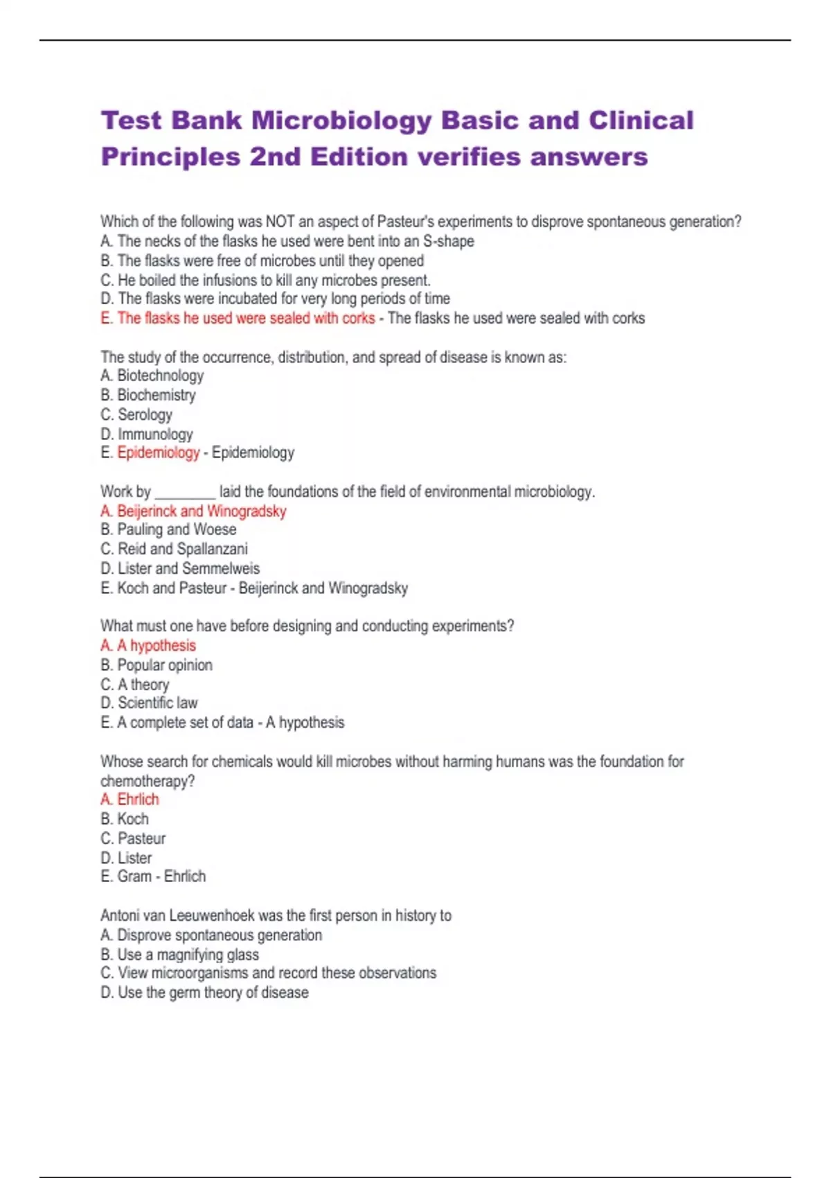 Test Bank Microbiology Basic and Clinical Principles 2nd Edition verifies answers Which of the following was NOT an aspect of Pasteur's experiments to disprove spontaneous generation? A. The necks of the flasks he used were bent into an S-shape B. The flasks were free of microbes until they opened C. He boiled the infusions to kill any microbes present. D. The flasks were incubated for very long periods of time E. The flasks he used were sealed with corks - The flasks he used were sealed with corks The study of the occurrence, distribution, and spread of disease is known as: A. Biotechnology B. Biochemistry C. Serology D. Immunology E. Epidemiology - Epidemiology Work by ________ laid the foundations of the field of environmental microbiology. A. Beijerinck and Winogradsky B. Pauling and Woese C. Reid and Spallanzani D. Lister and Semmelweis E. Koch and Pasteur - Beijerinck and Winogradsky What must one have before designing and conducting experiments? A. A hypothesis B. Popular opinion C. A theory D. Scientific law E. A complete set of data - A hypothesis Whose search for chemicals would kill microbes without harming humans was the foundation for chemotherapy? A. Ehrlich B. Koch C. Pasteur D. Lister E. Gram - Ehrlich