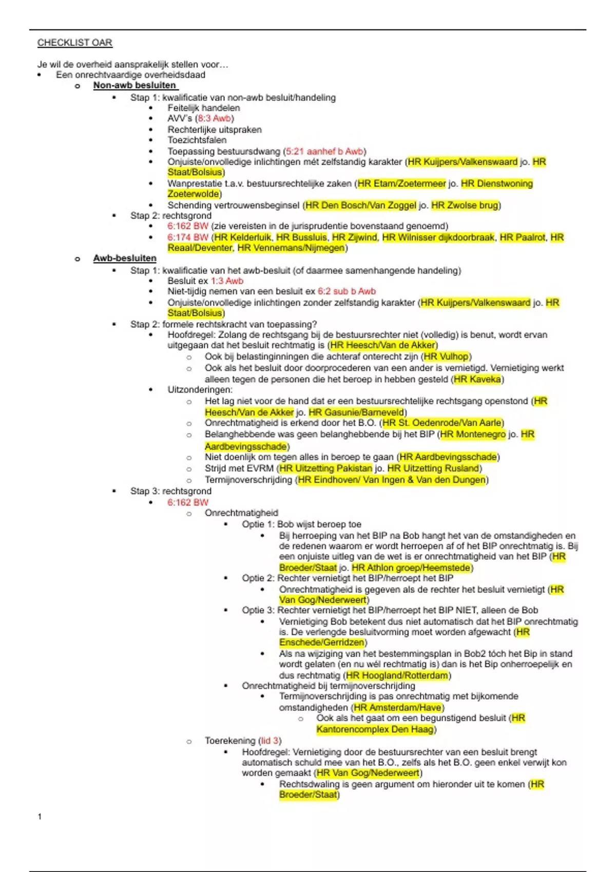 Stap voor stap checklist met alle jurisprudentie voor het vak Overheidsaansprakelijkheidsrecht. Onderwerpen: (i) Aansprakelijkheid voor non-Awb-besluiten (ii) Aansprakelijkheid voor Awb-besluiten (iii) Aansprakelijkheid op basis van 1 EP EVRM (iv) Aansprakelijkheid voor gedoogplichten (v) Aansprakelijkheid voor onteigening (vi) Nadeelcompensatie (vii) Onverplichte tegemoetkomingen