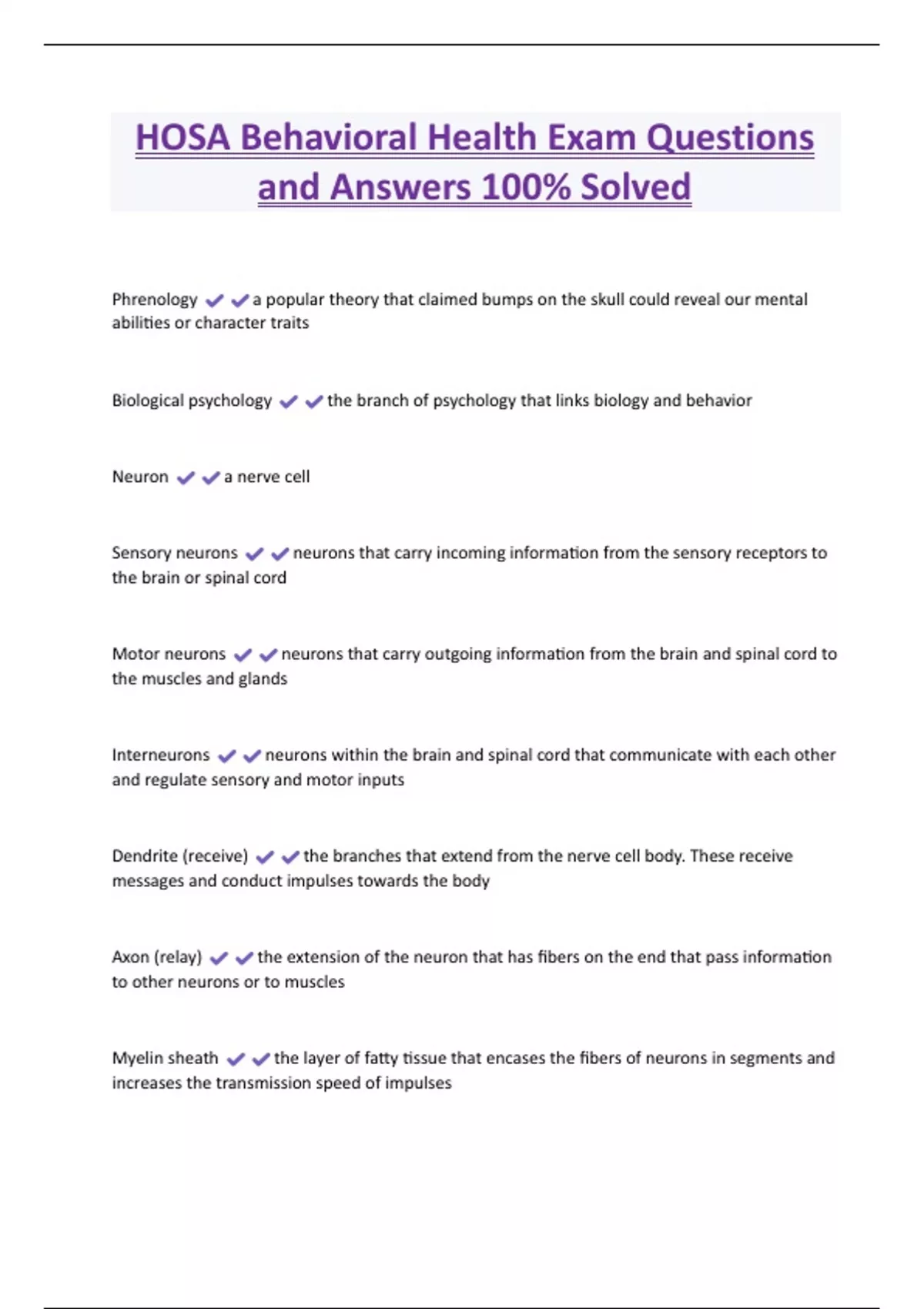 HOSA Behavioral Health Exam Questions and Answers 100% Solved Phrenology a popular theory that claimed bumps on the skull could reveal our mental abilities or character traits Biological psychology the branch of psychology that links biology and behavior Neuron a nerve cell Sensory neurons neurons that carry incoming information from the sensory receptors to the brain or spinal cord Motor neurons neurons that carry outgoing information from the brain and spinal cord to the muscles and glands Interneurons neurons within the brain and spinal cord that communicate with each other and regulate sensory and motor inputs