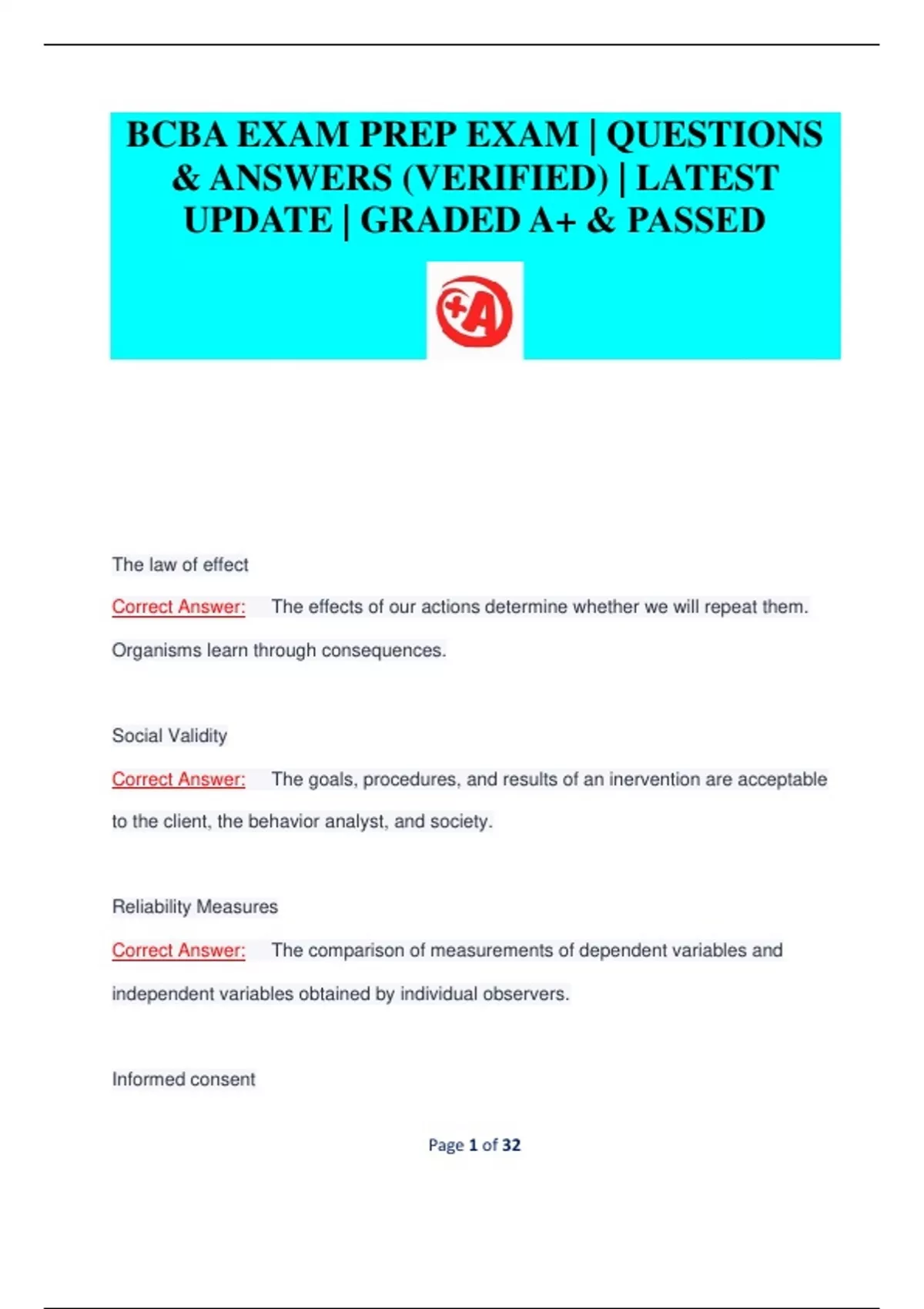BCBA EXAM PREP EXAM | QUESTIONS & ANSWERS (VERIFIED) | LATEST UPDATE | GRADED A+ & PASSED