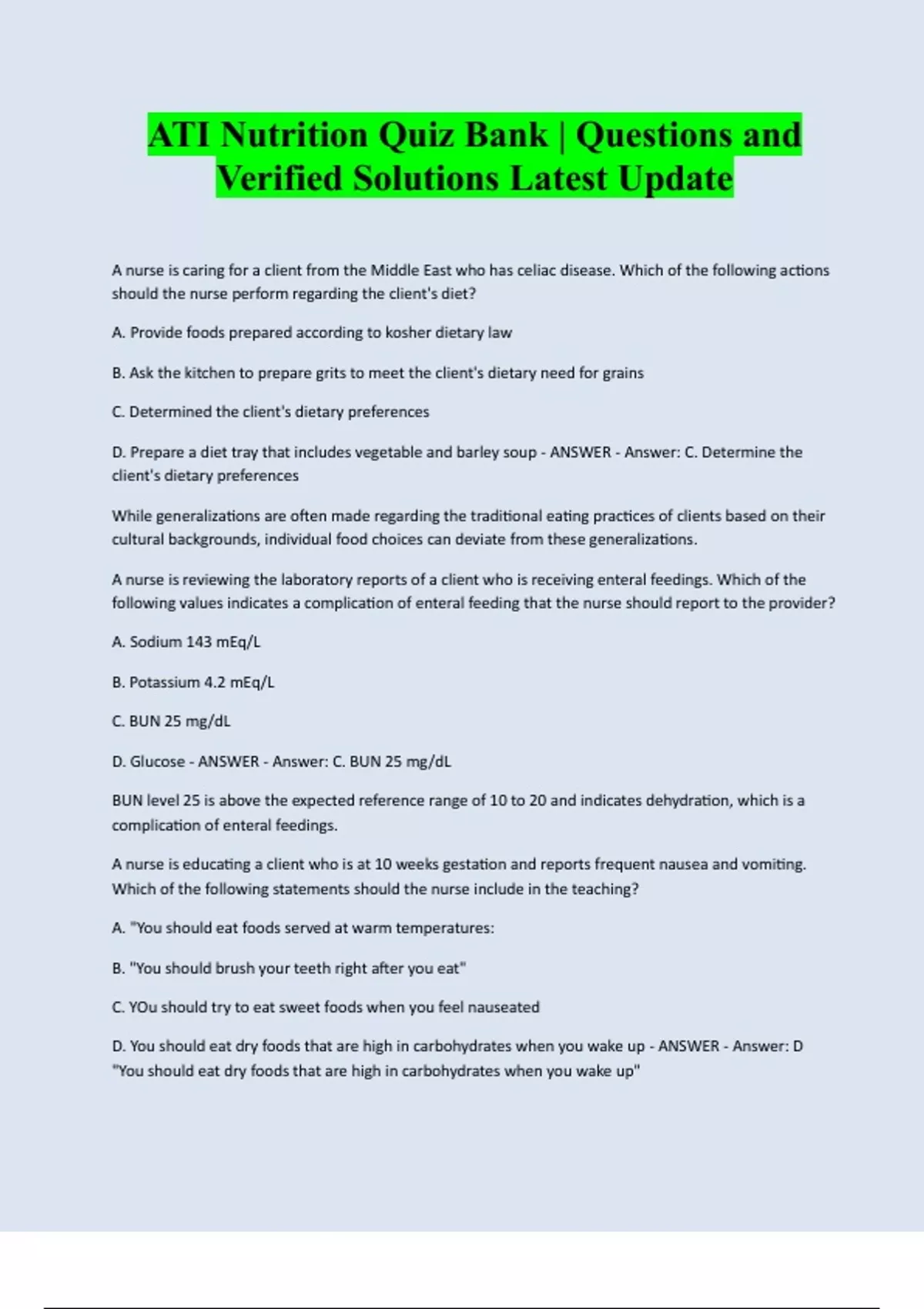 ATI Nutrition Quiz Bank | Questions and Verified Solutions Latest Update A nurse is caring for a client from the Middle East who has celiac disease. Which of the following actions should the nurse perform regarding the client's diet? A. Provide foods prepared according to kosher dietary law B. Ask the kitchen to prepare grits to meet the client's dietary need for grains C. Determined the client's dietary preferences D. Prepare a diet tray that includes vegetable and barley soup - ANSWER - Answer: C. Determine the client's dietary preferences While generalizations are often made regarding the traditional eating practices of clients based on their cultural backgrounds, individual food choices can deviate from these generalizations. A nurse is reviewing the laboratory reports of a client who is receiving enteral feedings. Which of the following values indicates a complication of enteral feeding that the nurse should report to the provider? A. Sodium 143 mEq/L B. Potassium 4.2 mEq/L C. BUN 25 mg/dL D. Glucose - ANSWER - Answer: C. BUN 25 mg/dL BUN level 25 is above the expected reference range of 10 to 20 and indicates dehydration, which is a complication of enteral feedings. A nurse is educating a client who is at 10 weeks gestation and reports frequent nausea and vomiting. Which of the following statements should the nurse include in the teaching? A. "You should eat foods served at warm temperatures: B. "You should brush your teeth right after you eat" C. YOu should try to eat sweet foods when you feel nauseated D. You should eat dry foods that are high in carbohydrates when you wake up - ANSWER - Answer: D "You should eat dry foods that are high in carbohydrates whe