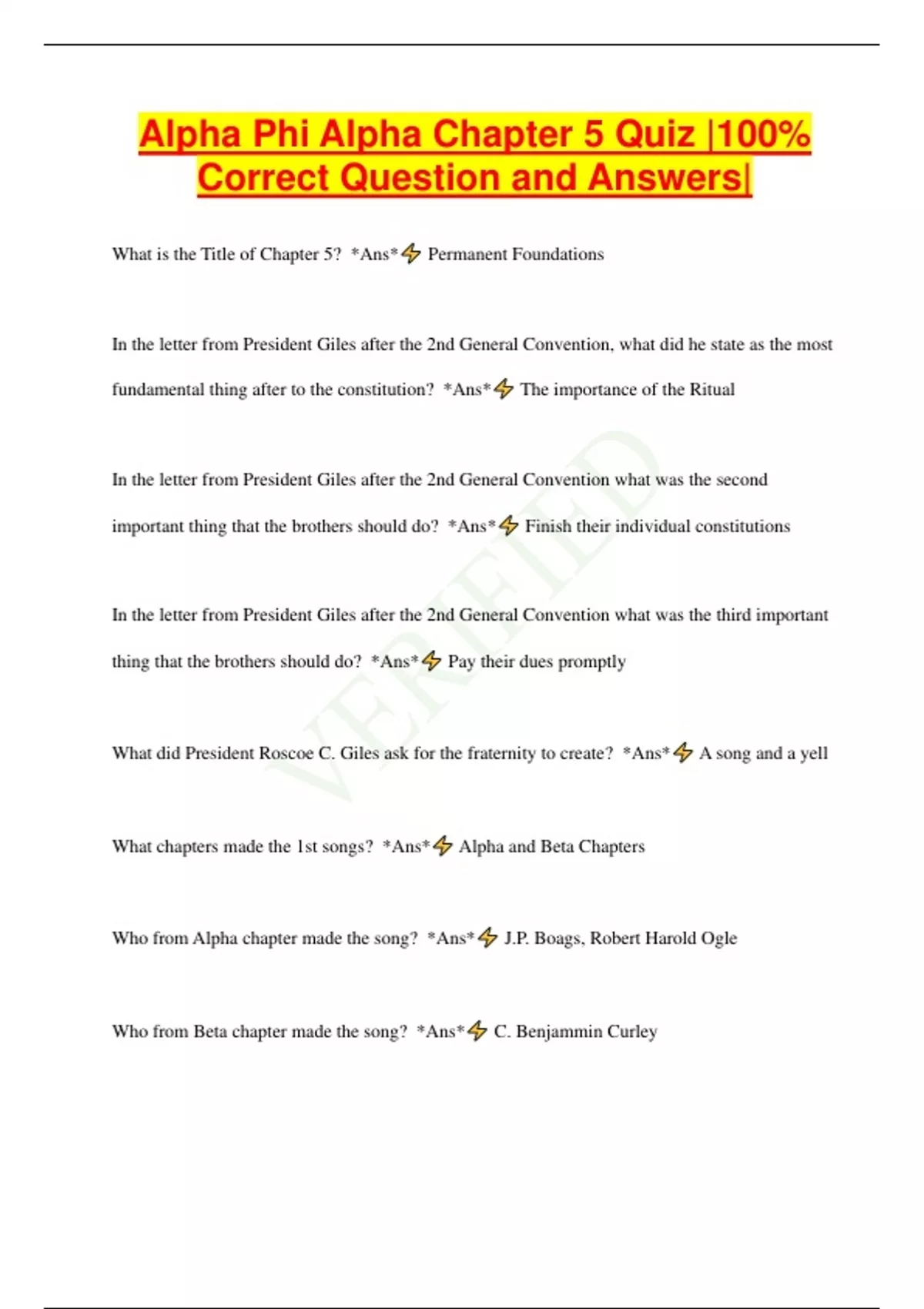 Alpha Phi Alpha Chapter 5 Quiz |100% Correct Question and Answers| What is the Title of Chapter 5? *Ans* Permanent Foundations In the letter from President Giles after the 2nd General Convention, what did he state as the most fundamental thing after to the constitution? *Ans* The importance of the Ritual In the letter from President Giles after the 2nd General Convention what was the second important thing that the brothers should do? *Ans* Finish their individual constitutions In the letter from President Giles after the 2nd General Convention what was the third important thing that the brothers should do? *Ans* Pay their dues promptly What did President Roscoe C. Giles ask for the fraternity to create? *Ans* A song and a yell What chapters made the 1st songs? *Ans* Alpha and Beta Chapters Who from Alpha chapter made the song? *Ans* J.P. Boags, Robert Harold Ogle Who from Beta chapter made the song? *Ans* C. Benjammin Curley