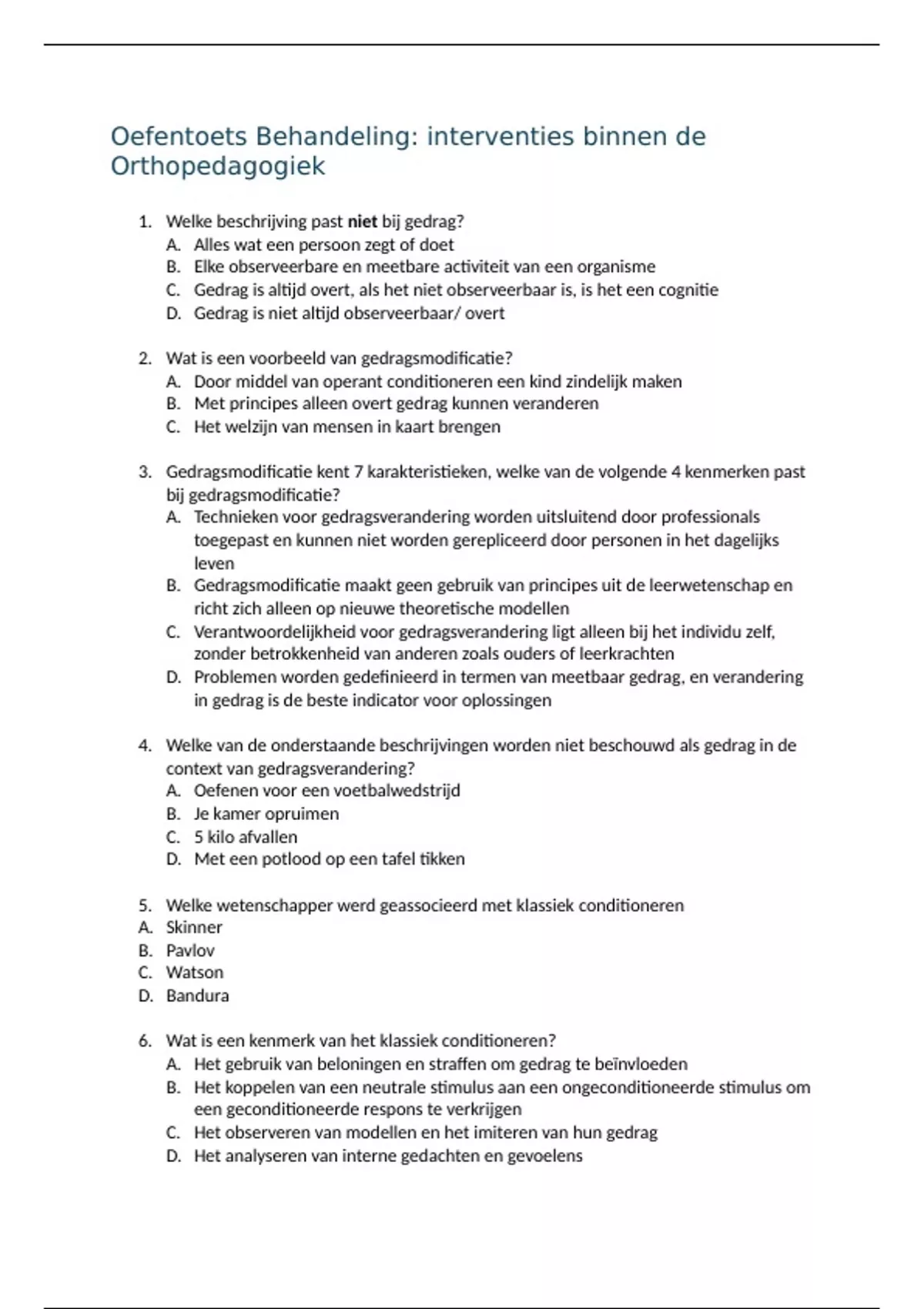 Aantekeningen van de colleges van het vak Behandeling: interventies binnen de orthopedagogiek met enkele oefenvragen overgenomen van de slides.