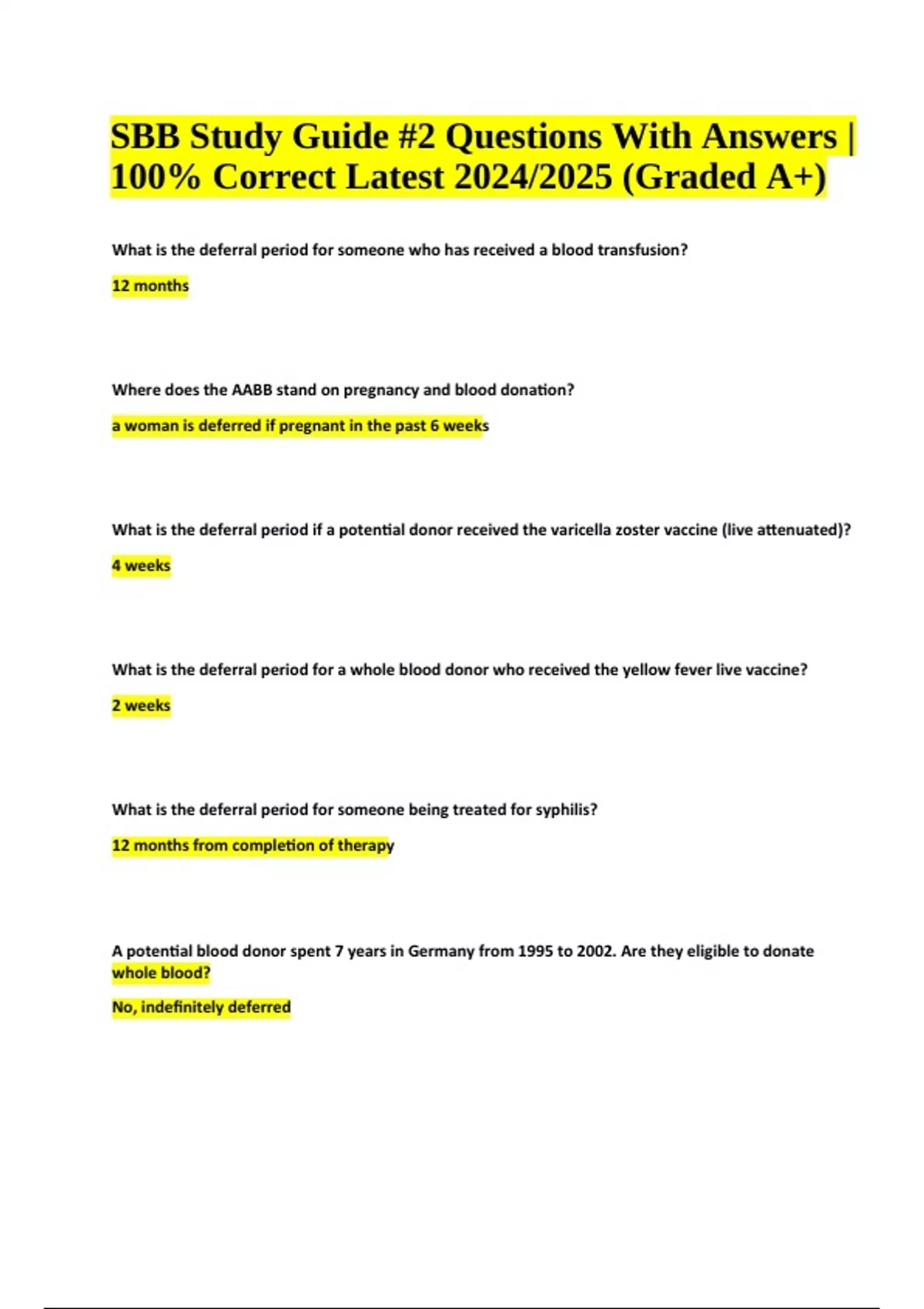 SBB Test Questions With Answers (100% Correct) Latest 2024/2025 (Graded A+) What is the deferral period for someone who has received a blood transfusion? 12 months Where does the AABB stand on pregnancy and blood donation? a woman is deferred if pregnant in the past 6 weeks What is the deferral period if a potential donor received the varicella zoster vaccine (live attenuated)? 4 weeks What is the deferral period for a whole blood donor who received the yellow fever live vaccine? 2 weeks What is the deferral period for someone being treated for syphilis? 12 months from completion of therapy A potential blood donor spent 7 years in Germany from 1995 to 2002. Are they eligible to donate whole blood? No, indefinitely deferred SBB Study Guide #2 Questions With Answers | 100% Correct Latest 2024/2025 (Graded A+) CJD may be transmitted by all of the following EXCEPT: 1. Neurosurgical instruments 2. human dura matter grafts 3. pituitary derived human growth hormone 4. stem cells Stem cells Which of the following should be indefinitely deferred? 1. donor with malaria 2. donor who has been incarcerated 3. a pregnant woman 4. a donor with a history of hepatitis after 11th birthday a donor with a history of hepatitis after 11th birthday A donor diagnosed with chronic myeloid leukemia is: