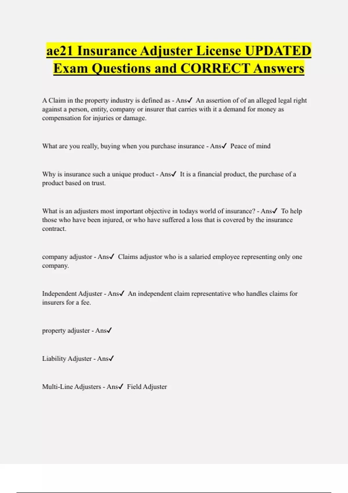 ae21 Insurance Adjuster License UPDATED Exam Questions and CORRECT Answers A Claim in the property industry is defined as - Ans An assertion of of an alleged legal right against a person, entity, company or insurer that carries with it a demand for money as compensation for injuries or damage. What are you really, buying when you purchase insurance - Ans Peace of mind Why is insurance such a unique product - Ans It is a financial product, the purchase of a product based on trust.