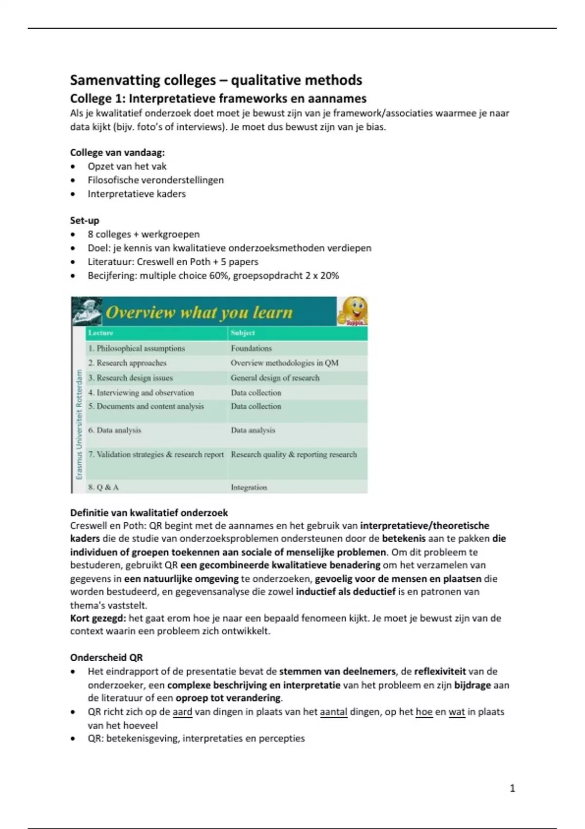 Samenvatting alle colleges Qualitative Methods - Behaalde cijfer: 9.7