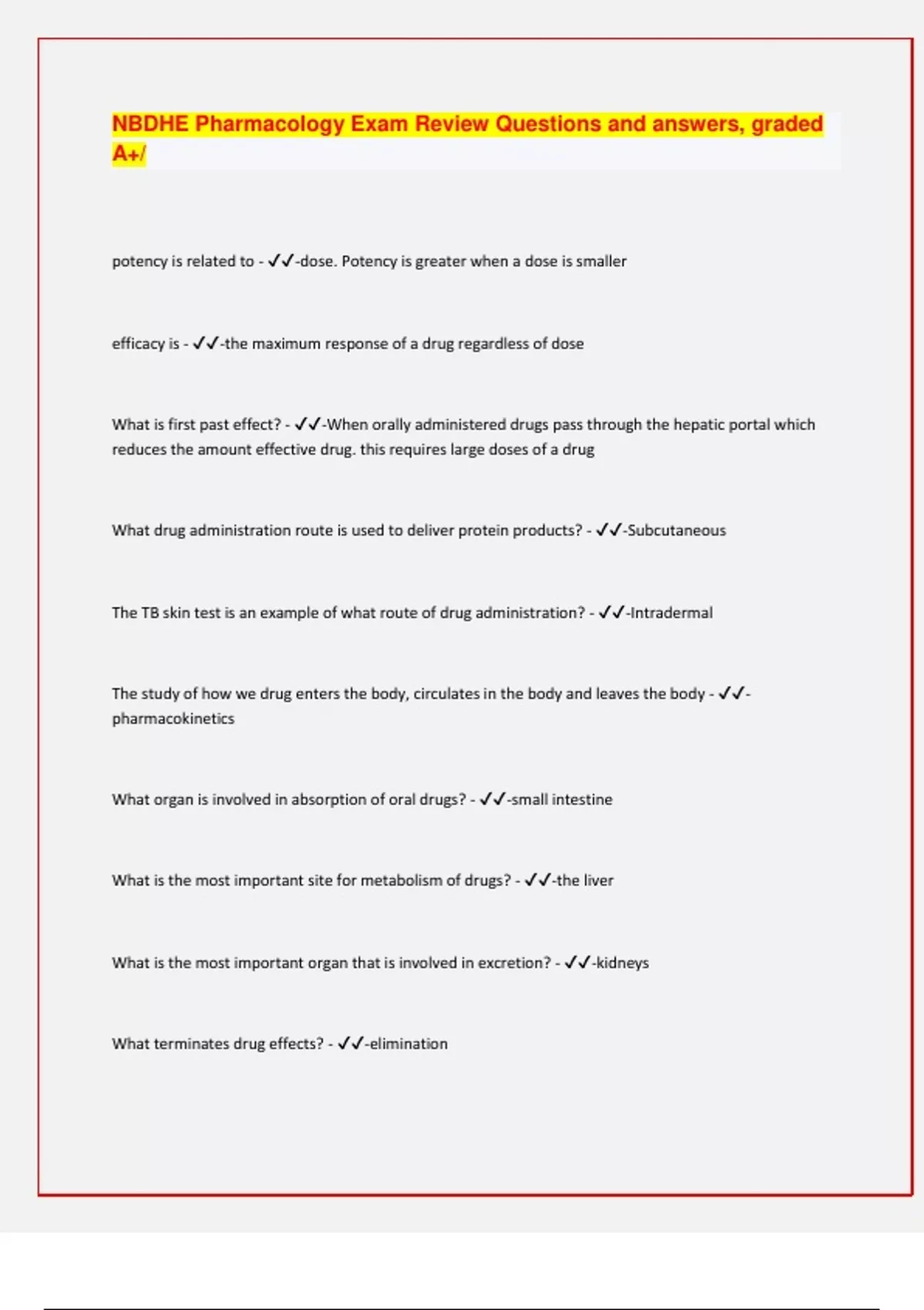 NBDHE Pharmacology Exam Review Questions and answers, graded A+/ potency is related to - -dose. Potency is greater when a dose is smaller efficacy is - -the maximum response of a drug regardless of dose What is first past effect? - -When orally administered drugs pass through the hepatic portal which reduces the amount effective drug. this requires large doses of a drug What drug administration route is used to deliver protein products? - -Subcutaneous The TB skin test is an example of what route of drug administration? - -Intradermal The study of how we drug enters the body, circulates in the body and leaves the body - - pharmacokinetics What organ is involved in absorption of oral drugs? - -small intestine What is the most important site for metabolism of drugs? - -the liver What is the most important organ that is involved in excretion? - -kidneys What terminates drug effects? - -elimination What steps do intra-vascular drugs bypass? - -absorption and first pass What drugs are known to move across biological membranes by diffusion? - -Lipid soluble drugs Metabolism is also known as - -Bio transformation Side effects are - -Dose related reaction that is not part of the desired therapeutic action True or false: an allergic reaction is related to dose - -false An abnormal drug response that is usually genetically determined - -Idiosyncrasy What are the two branches of the autonomic nervous system? - -Sympathetic and parasympathetic What are some effects of the sympathetic nervous system? - -Fight or flight