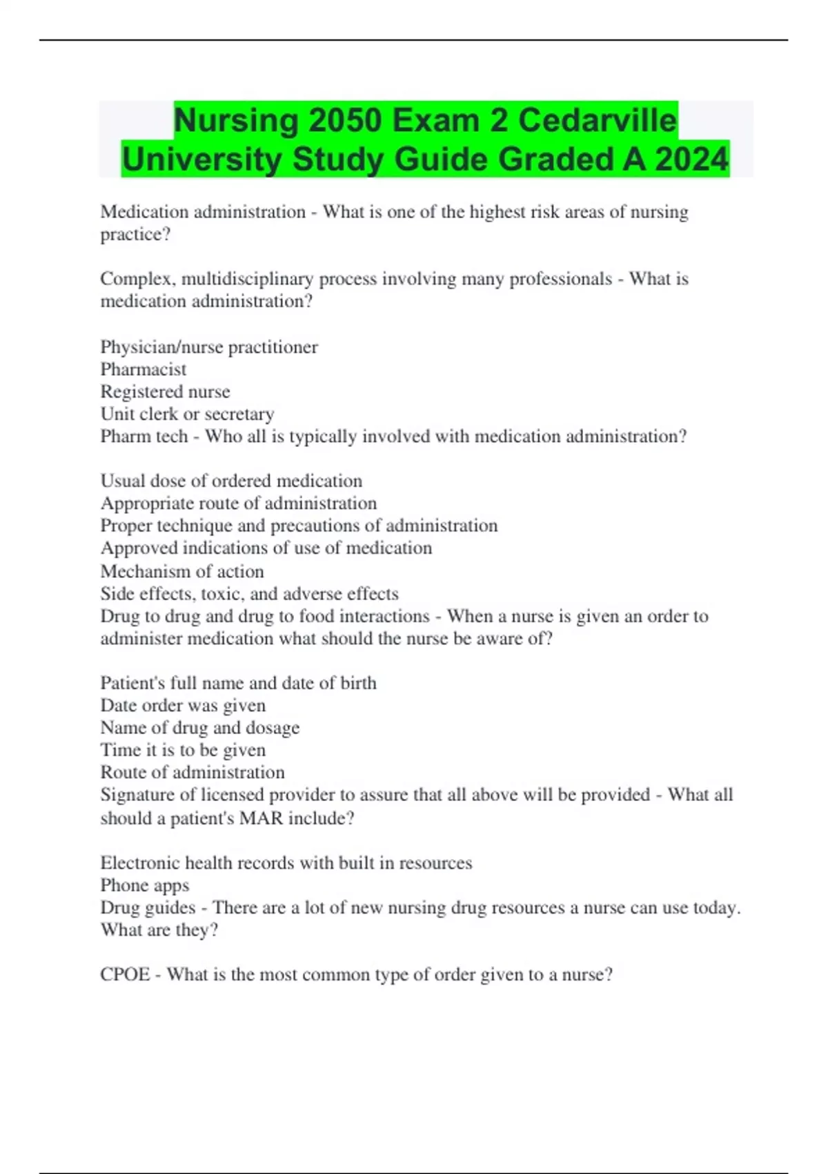 Medication administration - What is one of the highest risk areas of nursing practice? Complex, multidisciplinary process involving many professionals - What is medication administration? Physician/nurse practitioner Pharmacist Registered nurse Unit clerk or secretary Pharm tech - Who all is typically involved with medication administration? Usual dose of ordered medication Appropriate route of administration Proper technique and precautions of administration Approved indications of use of medication Mechanism of action Side effects, toxic, and adverse effects Drug to drug and drug to food interactions - When a nurse is given an order to administer medication what should the nurse be aware of? Patient's full name and date of birth Date order was given Name of drug and dosage Time it is to be given Route of administration Signature of licensed provider to assure that all above will be provided - What all should a patient's MAR include? Electronic health records with built in resources Phone apps Drug guides - There are a lot of new nursing drug resources a nurse can use today. What are they? CPOE - What is the most common type of order given to a nurse? Computer Physician Order Entry - What does CPOE stand for? In person or on the phone - Verbal orders can be _______. Write the order down and read it back - A nurse receives a verbal order to administer some pain medications to a patient. Upon receiving the order, what should the nurse do? 24 hours - Once a nurse gets a verbal order they need to the physician's signature within ________. Small and far and near between - Verbal orders should be_______. Written orders CPOE Verbal orders - What are the three most common type of orders for nurses? Right drug Right dose Right Patient Right route Right time Right documentation - In pharmacology class we learned about the five rights of drug administration. For NSG 2050, we learned about the six rights of drug administration. What are they? Check the MAR for ordered medication Check written order (MAR) with drug package upon taking it out (preparing it) of cabinet or drawer Check MAR before administering to patient once more - What are the three checks we discussed in NSG 2050? Partial doses - When administering medications, a nurse quickly becomes aware of each of the medication dosages. Upon looking at each dose, what should the nurse always be alert for? Tablets IV - What are the two most common partial dose drug forms?