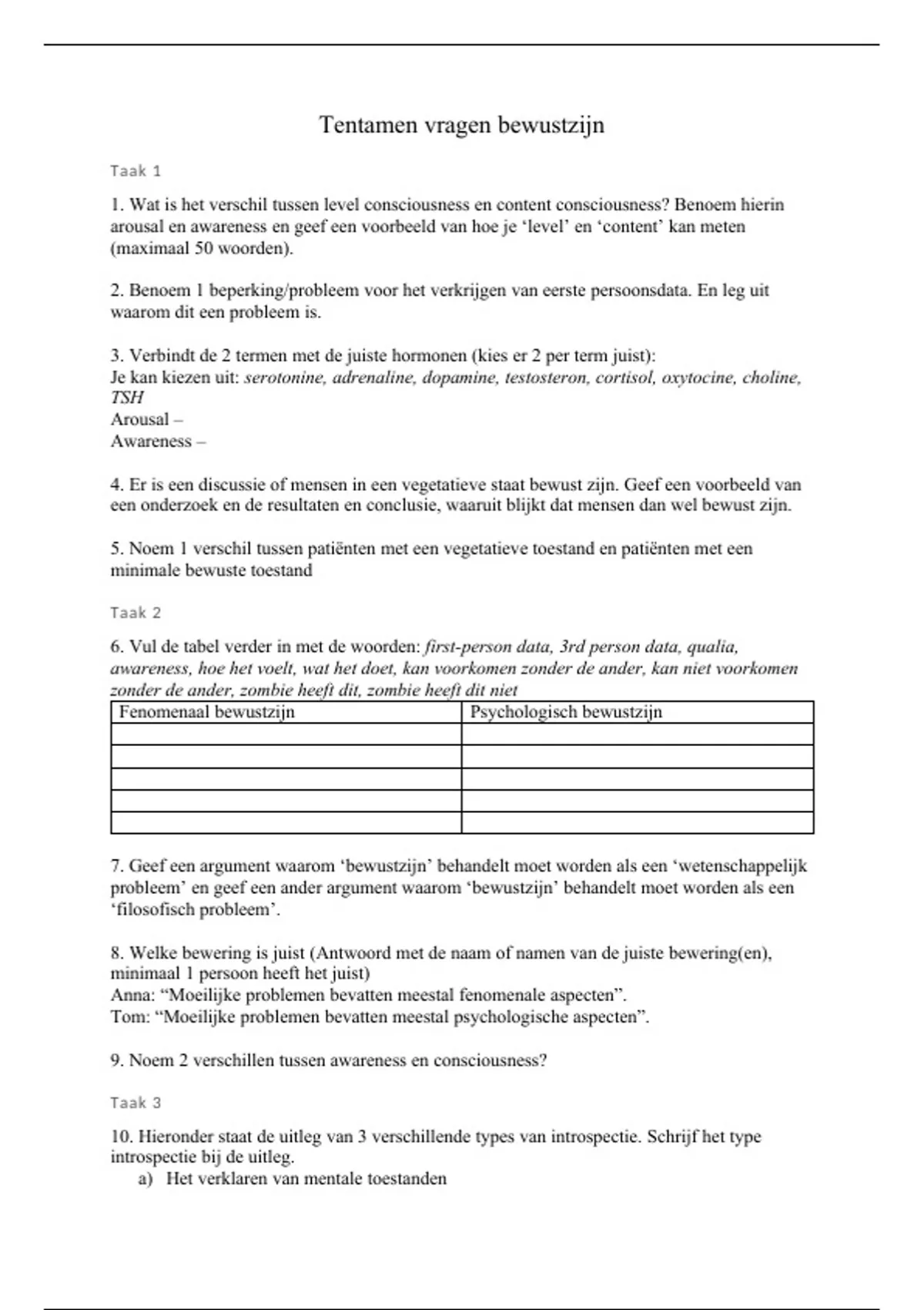 Tentamen vragen bewustzijn