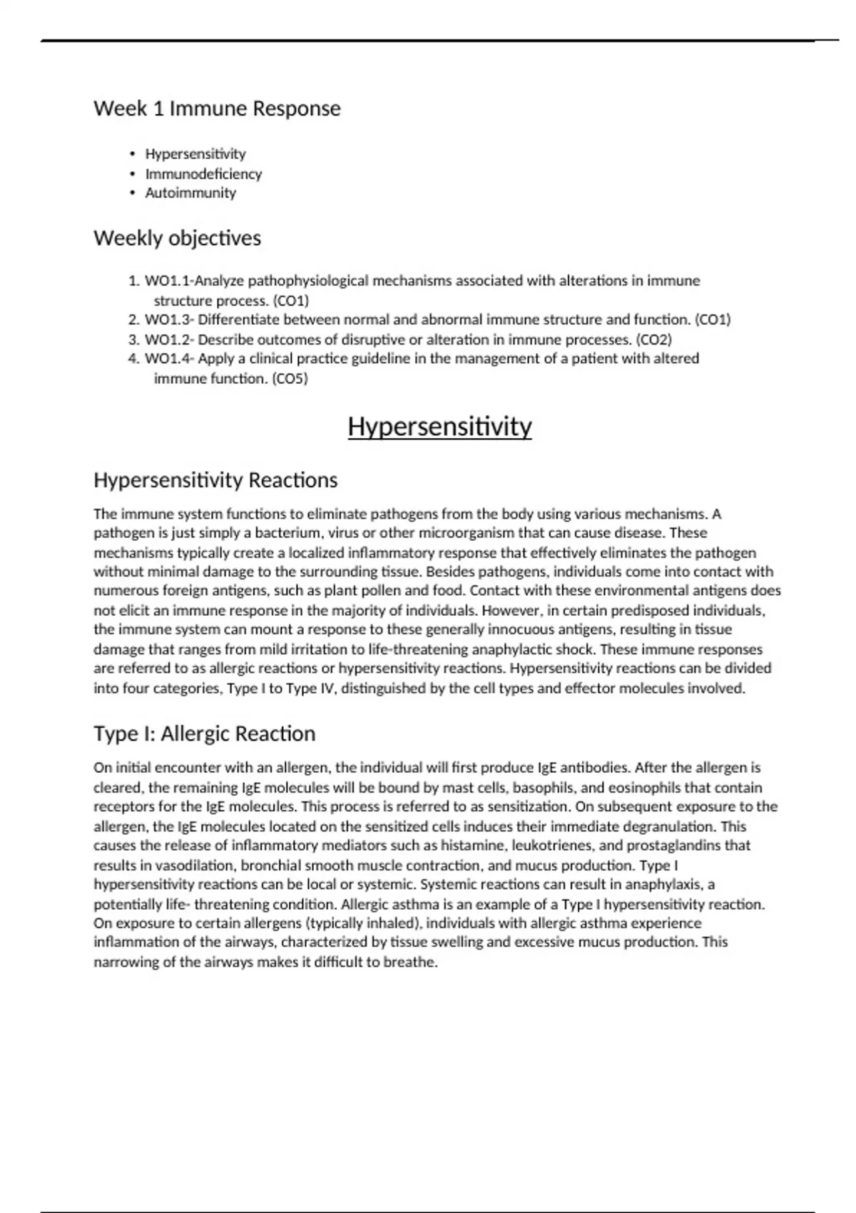 Week 1 Immune Response Hypersensitivity Immunodeficiency Autoimmunity Weekly objectives 1. WO1.1-Analyze pathophysiological mechanisms associated with alterations in immune structure process. (CO1) 2. WO1.3- Differentiate between normal and abnormal immune structure and function. (CO1) 3. WO1.2- Describe outcomes of disruptive or alteration in immune processes. (CO2) 4. WO1.4- Apply a clinical practice guideline in the management of a patient with altered immune function. (CO5) Hypersensitivity Hypersensitivity Reactions The immune system functions to eliminate pathogens from the body using various mechanisms. A pathogen is just simply a bacterium, virus or other microorganism that can cause disease. These mechanisms typically create a localized inflammatory response that effectively eliminates the pathogen without minimal damage to the surrounding tissue. Besides pathogens, individuals come into contact with numerous foreign antigens, such as plant pollen and food. Contact with these environmental antigens does not elicit an immune response in the majority of individuals. However, in certain predisposed individuals, the immune system can mount a response to these generally innocuous antigens, resulting in tissue damage that ranges from mild irritation to life-threatening anaphylactic shock. These immune responses are referred to as allergic reactions or hypersensitivity reactions. Hypersensitivity reactions can be divided into four categories, Type I to Type IV, distinguished by the cell types and effector molecules involved.
