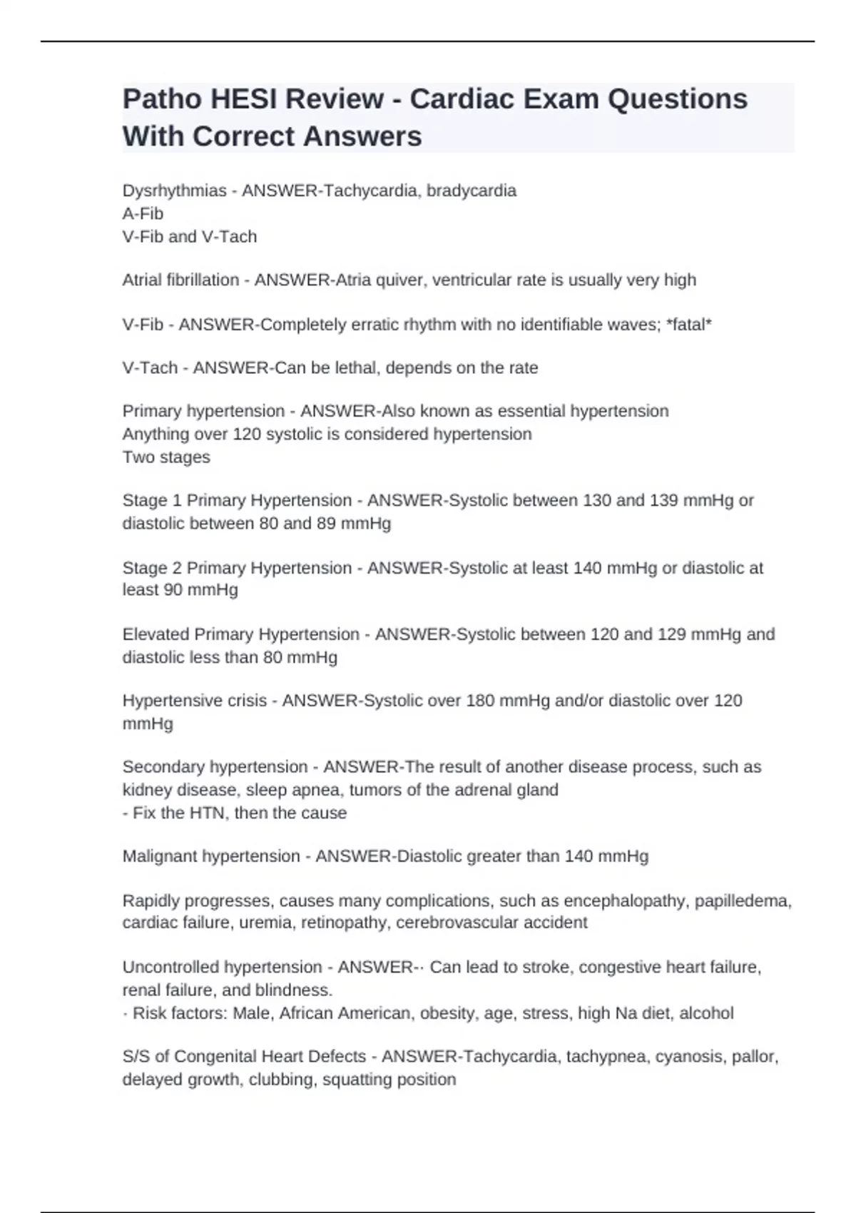 Dysrhythmias - ANSWER-Tachycardia, bradycardia A-Fib V-Fib and V-Tach Atrial fibrillation - ANSWER-Atria quiver, ventricular rate is usually very high V-Fib - ANSWER-Completely erratic rhythm with no identifiable waves; *fatal* V-Tach - ANSWER-Can be lethal, depends on the rate Primary hypertension - ANSWER-Also known as essential hypertension Anything over 120 systolic is considered hypertension Two stages Stage 1 Primary Hypertension - ANSWER-Systolic between 130 and 139 mmHg or diastolic between 80 and 89 mmHg Stage 2 Primary Hypertension - ANSWER-Systolic at least 140 mmHg or diastolic at least 90 mmHg Elevated Primary Hypertension - ANSWER-Systolic between 120 and 129 mmHg and diastolic less than 80 mmHg Hypertensive crisis - ANSWER-Systolic over 180 mmHg and/or diastolic over 120 mmHg Secondary hypertension - ANSWER-The result of another disease process, such as kidney disease, sleep apnea, tumors of the adrenal gland - Fix the HTN, then the cause Malignant hypertension - ANSWER-Diastolic greater than 140 mmHg Rapidly progresses, causes many complications, such as encephalopathy, papilledema, cardiac failure, uremia, retinopathy, cerebrovascular accident Uncontrolled hypertension - ANSWER-· Can lead to stroke, congestive heart failure, renal failure, and blindness. · Risk factors: Male, African American, obesity, age, stress, high Na diet, alcohol S/S of Congenital Heart Defects - ANSWER-Tachycardia, tachypnea, cyanosis, pallor, delayed growth, clubbing, squatting position