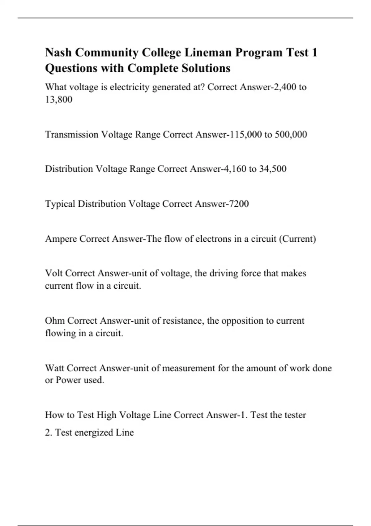 Nash Community College Lineman Program Test 1 Questions with Complete Solutions