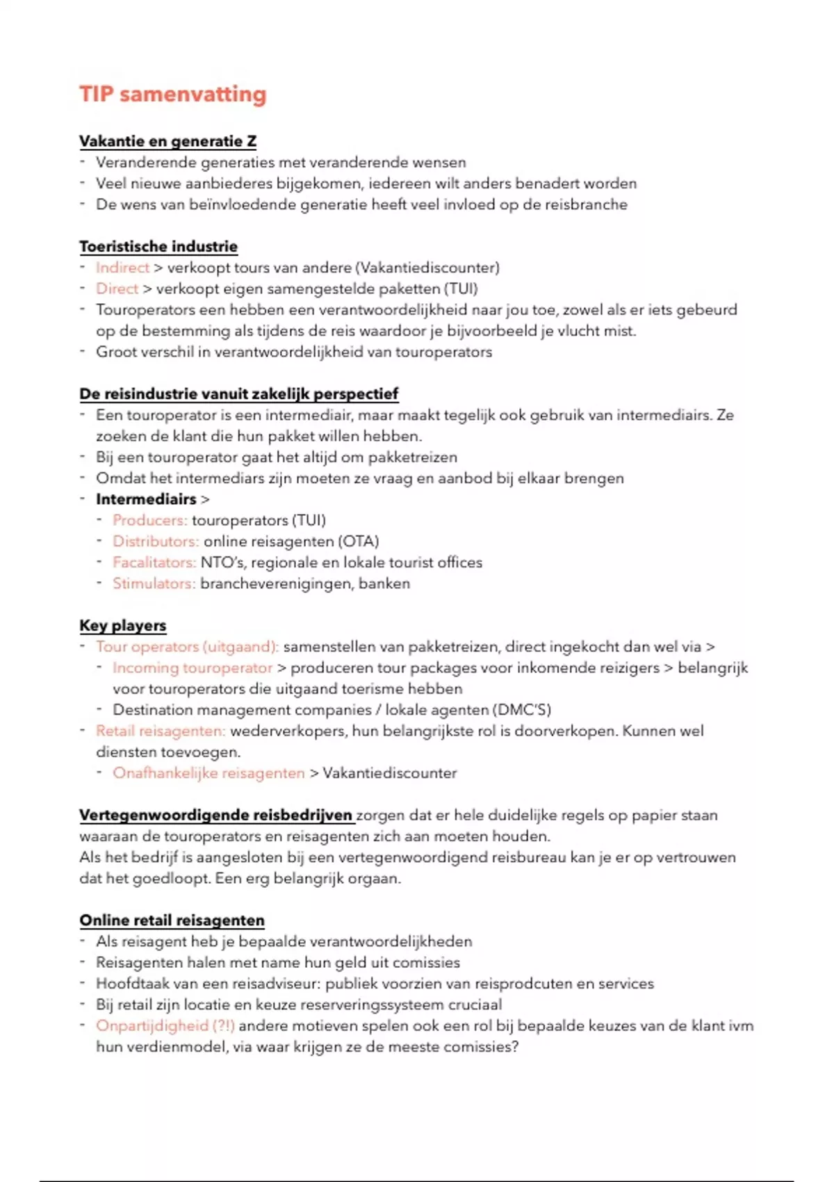 In deze samenvatting staan de aantekeningen van de colleges, de gastcolleges van de reisbureaus samengevat en extra aantekeningen uit de powerpoints.