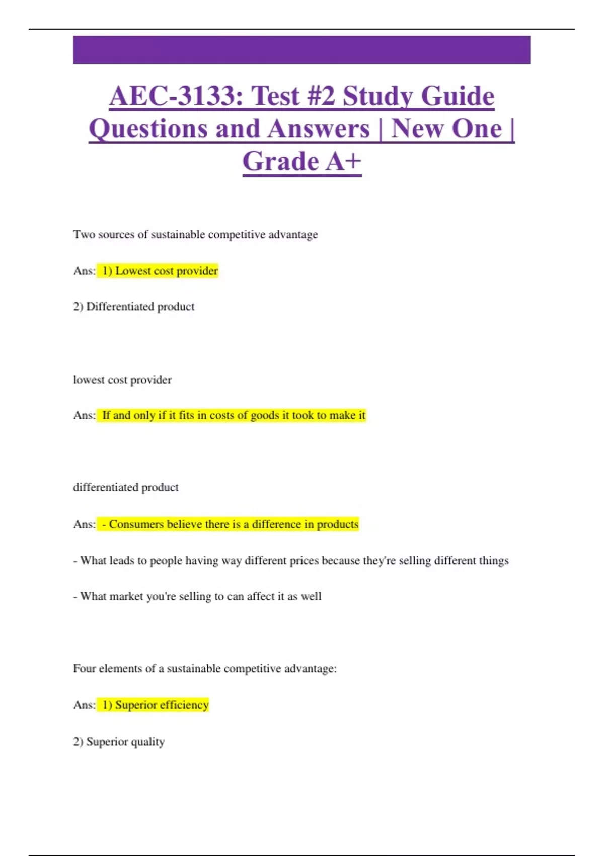 Two sources of sustainable competitive advantage Ans: 1) Lowest cost provider 2) Differentiated product lowest cost provider Ans: If and only if it fits in costs of goods it took to make it differentiated product Ans: - Consumers believe there is a difference in products - What leads to people having way different prices because they're selling different things - What market you're selling to can affect it as well Four elements of a sustainable competitive advantage: Ans: 1) Superior efficiency 2) Superior quality 3) Superior innovation 4) Superior customer responsivenes