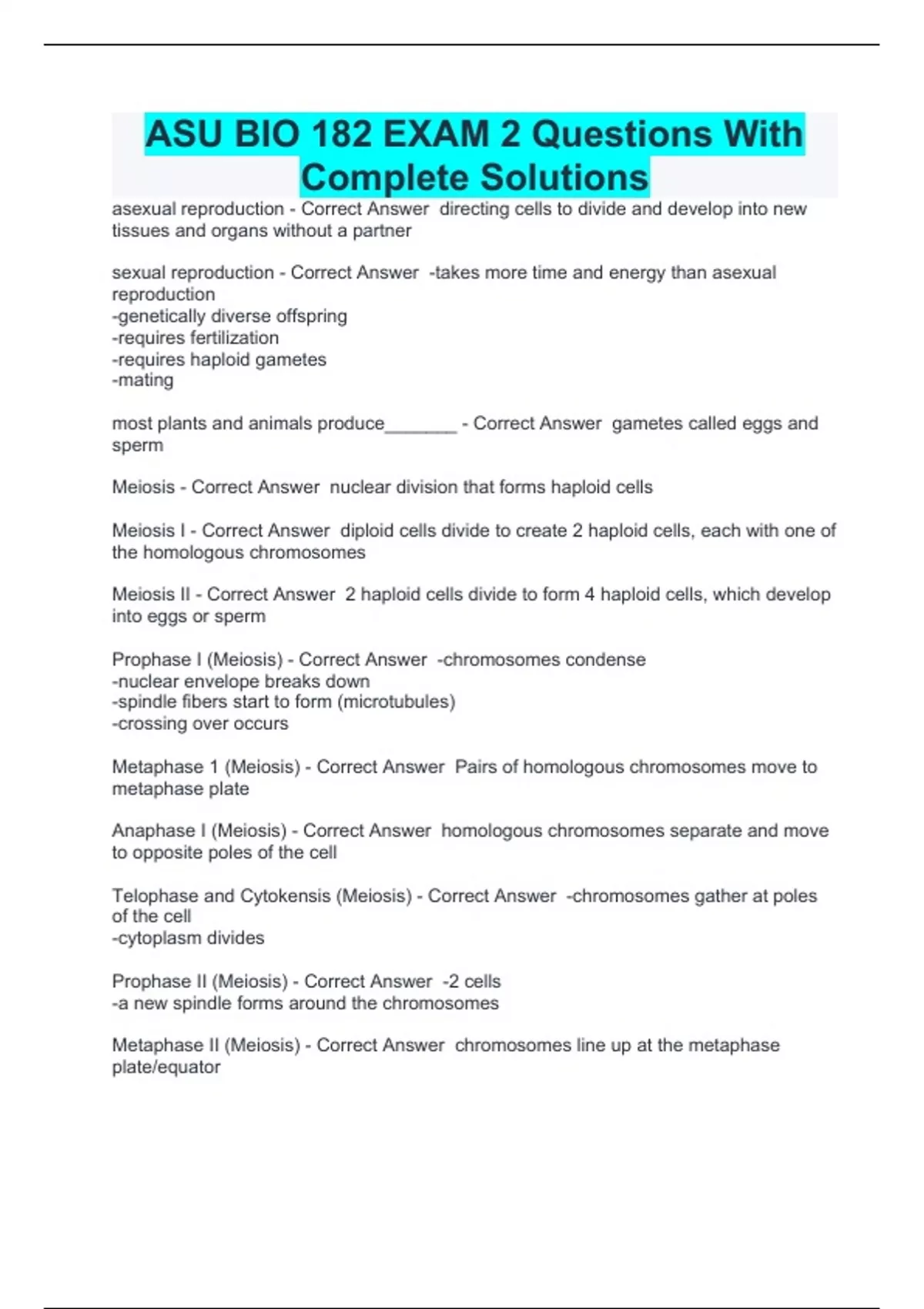 ASU BIO 182 EXAM 2 Questions With Complete Solutions asexual reproduction - Correct Answer directing cells to divide and develop into new tissues and organs without a partner sexual reproduction - Correct Answer -takes more time and energy than asexual reproduction -genetically diverse offspring -requires fertilization -requires haploid gametes -mating most plants and animals produce_______ - Correct Answer gametes called eggs and sperm Meiosis - Correct Answer nuclear division that forms haploid cells Meiosis I - Correct Answer diploid cells divide to create 2 haploid cells, each with one of the homologous chromosomes Meiosis II - Correct Answer 2 haploid cells divide to form 4 haploid cells, which develop into eggs or sperm Prophase I (Meiosis) - Correct Answer -chromosomes condense -nuclear envelope breaks down -spindle fibers start to form (microtubules) -crossing over occurs Metaphase 1 (Meiosis) - Correct Answer Pairs of homologous chromosomes move to metaphase plate Anaphase I (Meiosis) - Correct Answer homologous chromosomes separate and move to opposite poles of the cell Telophase and Cytokensis (Meiosis) - Correct Answer -chromosomes gather at poles of the cell