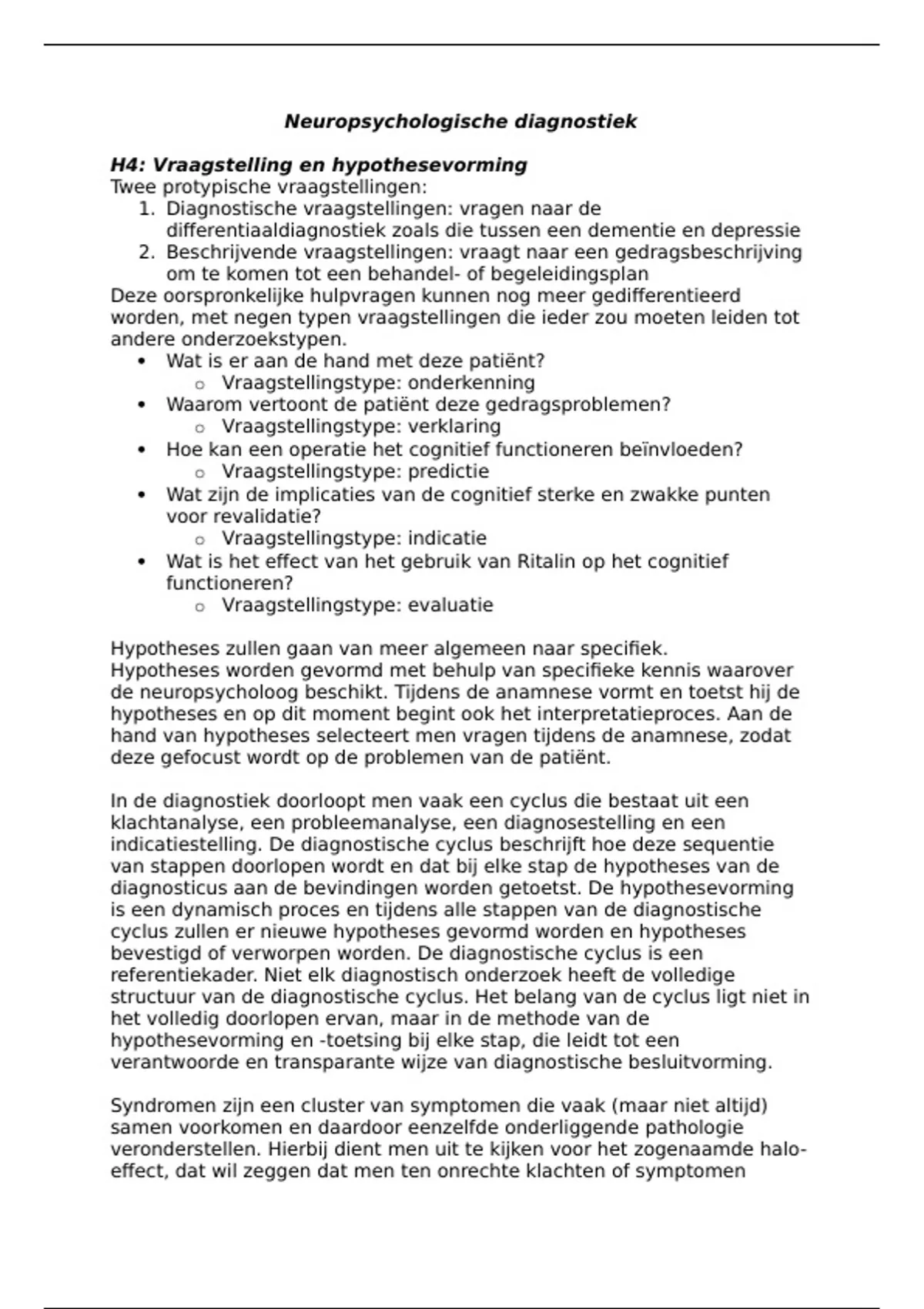 Samenvatting van het boek en artikelen Neuropsychologische Diagnostiek. Vak aan de Universiteit Utrecht binnen de psychologie-opleiding. Bevat ook de artikelen. Met deze samenvatting heb ik een 8,9 gehaald voor het tentamen!