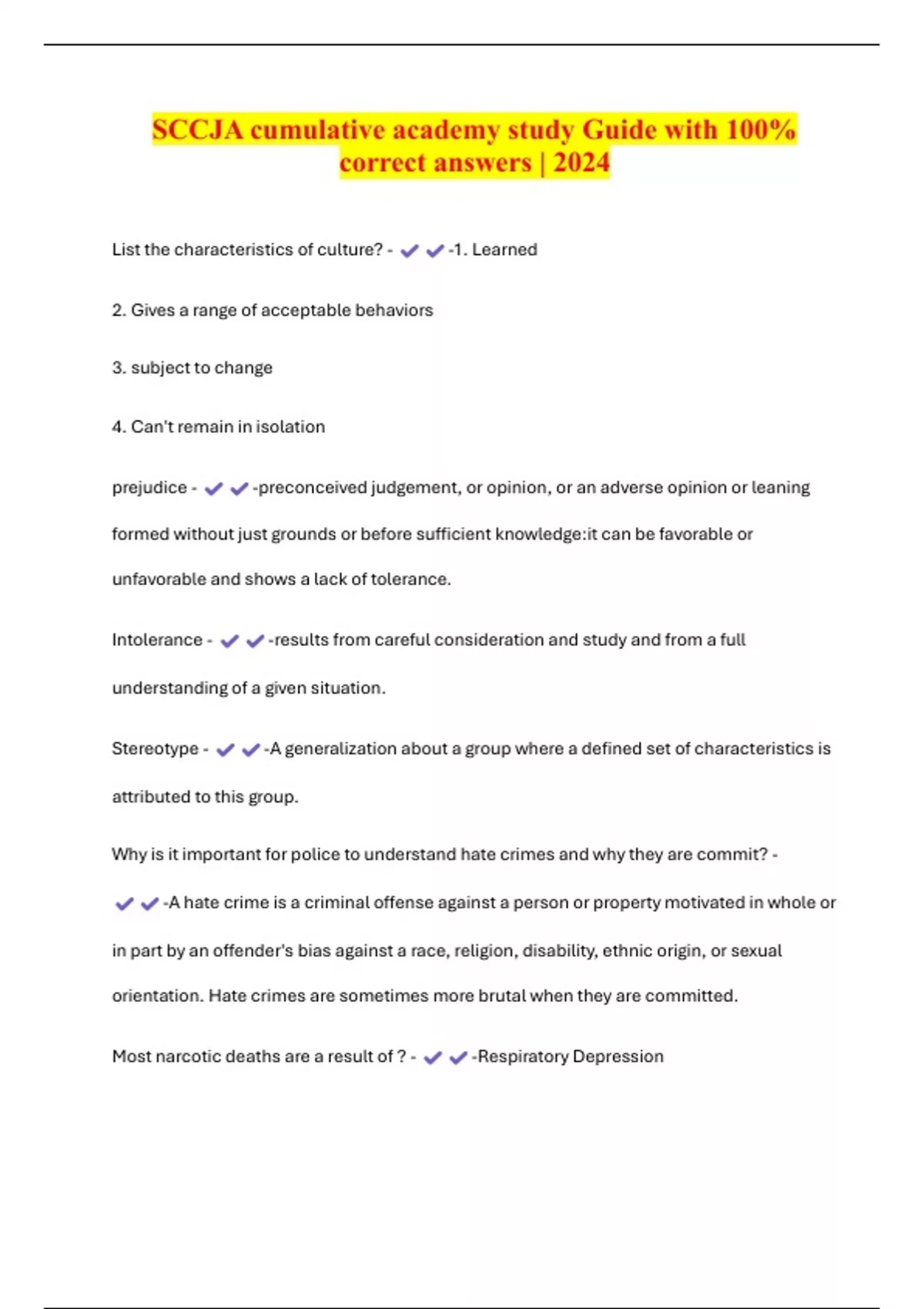 SCCJA cumulative academy study Guide with 100% correct answers | 2024 List the characteristics of culture? - -1. Learned 2. Gives a range of acceptable behaviors 3. subject to change 4. Can't remain in isolation prejudice - -preconceived judgement, or opinion, or an adverse opinion or leaning formed without just grounds or before sufficient knowledge:it can be favorable or unfavorable and shows a lack of tolerance. Intolerance - -results from careful consideration and study and from a full understanding of a given situation. Stereotype - -A generalization about a group where a defined set of characteristics is attributed to this group. Why is it important for police to understand hate crimes and why they are commit? - -A hate crime is a criminal offense against a person or property motivated in whole or in part by an offender's bias against a race, religion, disability, ethnic origin, or sexual orientation. Hate crimes are sometimes more brutal when they are committed. Most narcotic deaths are a result of ? - -Respiratory Depression If you neglect a vulnerable adult, what is the maximum prison sentence for this felony? - -5 years If you exploit a vulnerable adult, you can be charged a maximum fine or given a maximum prison sentence. What is the max fine and max sentence? - -$5000.00 or 5 Years What threat level of vest only protects against .22, .25 and .32 caliber weapons? - - Level 1 If a business is robbed, who (name) shall be listed as the victim on the police report? - -Business name: As teaching note - you will also list all of the people who were victims of the robbery as well. Which Generational group has the largest generation in the workforce? Born between 1946 - 1964 - -Baby Boomers Which Generational group has the second largest generation in the workforce? Born between - -Generation X Which Generational group has a strong sense of civic pride? Born between - -Generation Y (Millennials) What 2 elements must an officer prove to charge someone with PWID? - -1. Person possessed the drugs 2. He/she intended distribute the drugs Can "acquaintance" be used on the report if you know the nature of the relationship? - -No - If you know the relationship it should be listed specifically. When a person conforms to group norms because it appears that is what is expected it is called? - -Group prejudice This is known as a popular "date rape" drug? - -Rohypnol or Flunitrazepam - Also known as roofies. If you abuse a vulnerable adult, what is your max prison sentence for this felony? - -5 years What is the most frequently encoun