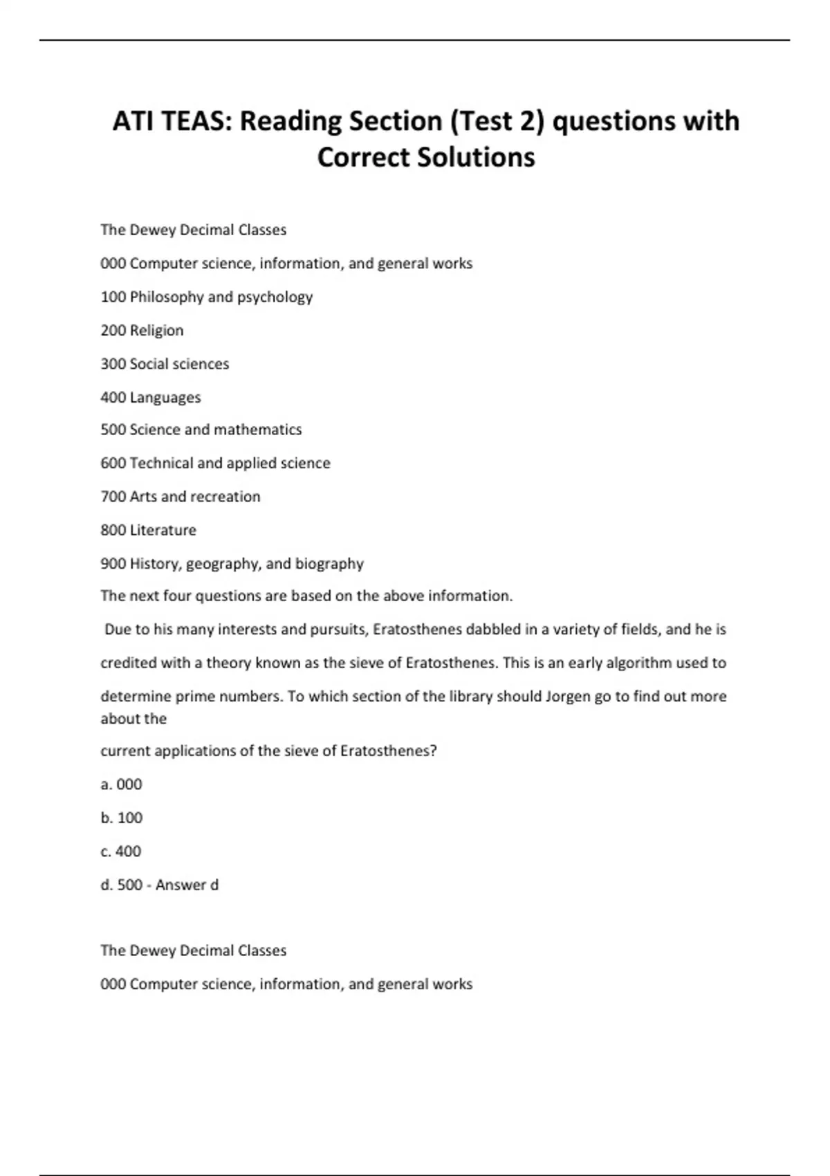 The Dewey Decimal Classes 000 Computer science, information, and general works 100 Philosophy and psychology 200 Religion 300 Social sciences 400 Languages 500 Science and mathematics 600 Technical and applied science 700 Arts and recreation 800 Literature 900 History, geography, and biography The next four questions are based on the above information. Due to his many interests and pursuits, Eratosthenes dabbled in a variety of fields, and he is credited with a theory known as the sieve of Eratosthenes. This is an early algorithm used to determine prime numbers. To which section of the library should Jorgen go to find out more about the current applications of the sieve of Eratosthenes? a. 000 b. 100 c. 400 d. 500 - Answer d