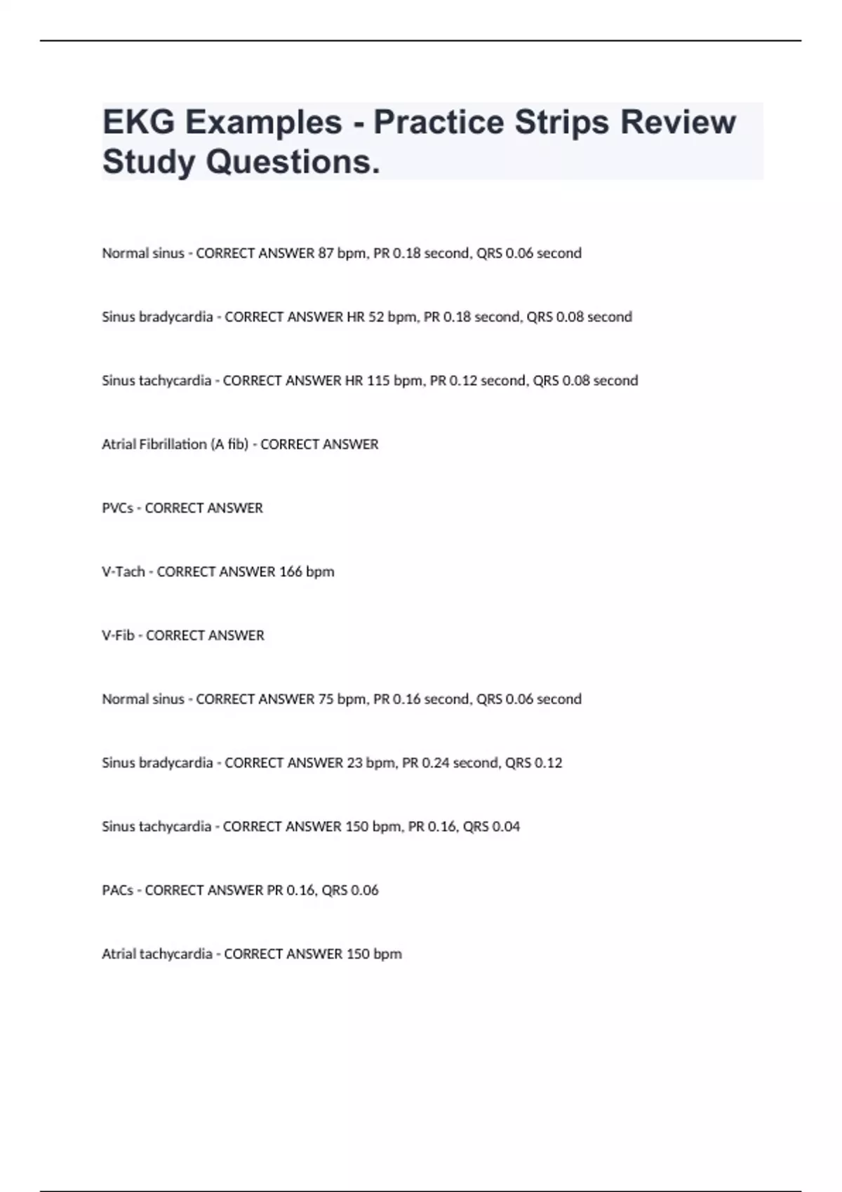 EKG Examples - Practice Strips Review Study Questions. Normal sinus - CORRECT ANSWER 87 bpm, PR 0.18 second, QRS 0.06 second Sinus bradycardia - CORRECT ANSWER HR 52 bpm, PR 0.18 second, QRS 0.08 second Sinus tachycardia - CORRECT ANSWER HR 115 bpm, PR 0.12 second, QRS 0.08 second Atrial Fibrillation (A fib) - CORRECT ANSWER PVCs - CORRECT ANSWER V-Tach - CORRECT ANSWER 166 bpm V-Fib - CORRECT ANSWER Normal sinus - CORRECT ANSWER 75 bpm, PR 0.16 second, QRS 0.06 second Sinus bradycardia - CORRECT ANSWER 23 bpm, PR 0.24 second, QRS 0.12 Sinus tachycardia - CORRECT ANSWER 150 bpm, PR 0.16, QRS 0.04 PACs - CORRECT ANSWER PR 0.16, QRS 0.06 Atrial tachycardia - CORRECT ANSWER 150 bpm