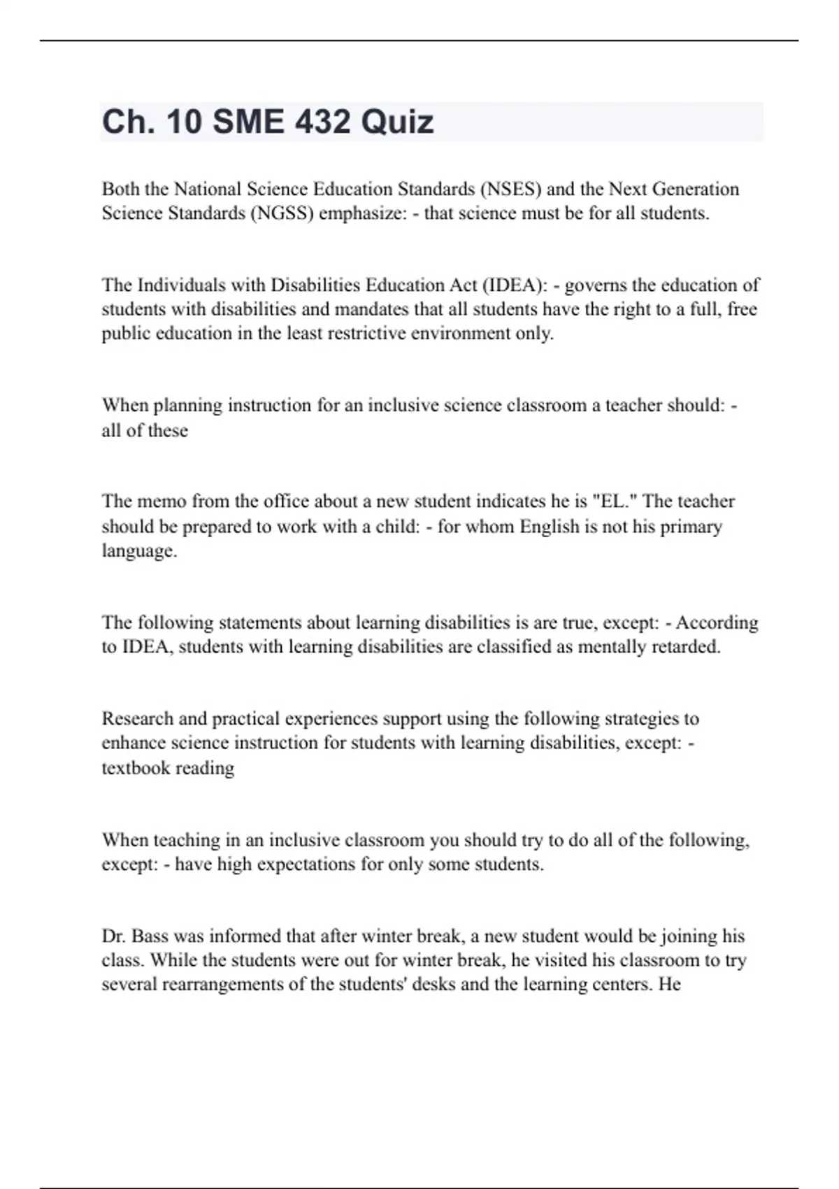 Both the National Science Education Standards (NSES) and the Next Generation Science Standards (NGSS) emphasize: - that science must be for all students. The Individuals with Disabilities Education Act (IDEA): - governs the education of students with disabilities and mandates that all students have the right to a full, free public education in the least restrictive environment only. When planning instruction for an inclusive science classroom a teacher should: - all of these