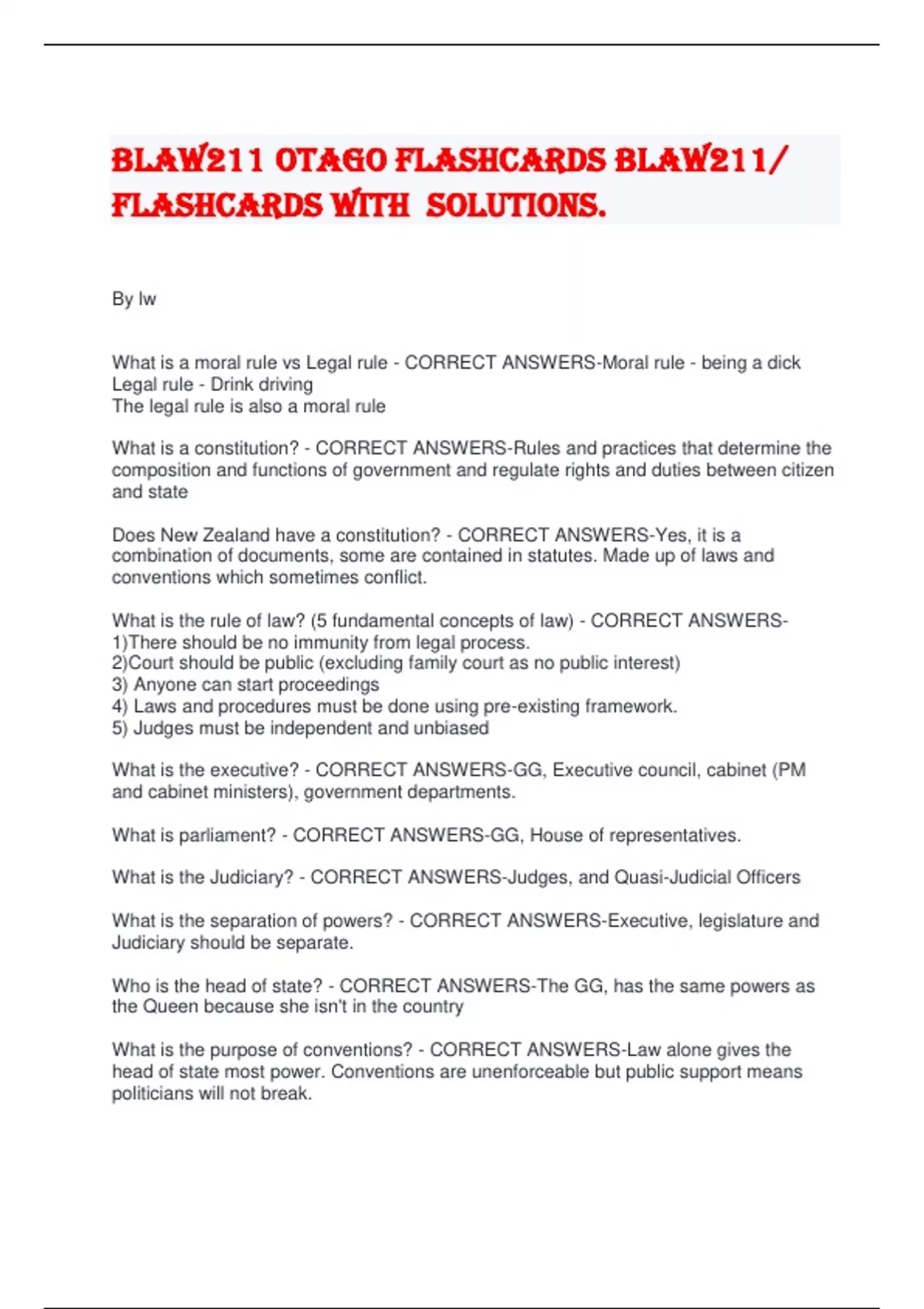 BLAW211 Otago Flashcards BLAW211/ Flashcards with Solutions. By lw What is a moral rule vs Legal rule - CORRECT ANSWERS-Moral rule - being a dick Legal rule - Drink driving The legal rule is also a moral rule What is a constitution? - CORRECT ANSWERS-Rules and practices that determine the composition and functions of government and regulate rights and duties between citizen and state Does New Zealand have a constitution? - CORRECT ANSWERS-Yes, it is a combination of documents, some are contained in statutes. Made up of laws and conventions which sometimes conflict. What is the rule of law? (5 fundamental concepts of law) - CORRECT ANSWERS1)There should be no immunity from legal process. 2)Court should be public (excluding family court as no public interest) 3) Anyone can start proceedings 4) Laws and procedures must be done using pre-existing framework. 5) Judges must be independent and unbiased What is the executive? - CORRECT ANSWERS-GG, Executive council, cabinet (PM and cabinet ministers), government departments. What is parliament? - CORRECT ANSWERS-GG, House of representatives. What is the Judiciary? - CORRECT ANSWERS-Judges, and Quasi-Judicial Officers What is the separation of powers? - CORRECT ANSWERS-Executive, legislature and Judiciary should be separate. Who is the head of state? - CORRECT ANSWERS-The GG, has the same powers as the Queen because she isn't in the country What is the purpose of conventions? - CORRECT ANSWERS-Law alone gives the head of state most power. Conventions are unenforceable but public support means politicians will not break. How does law an