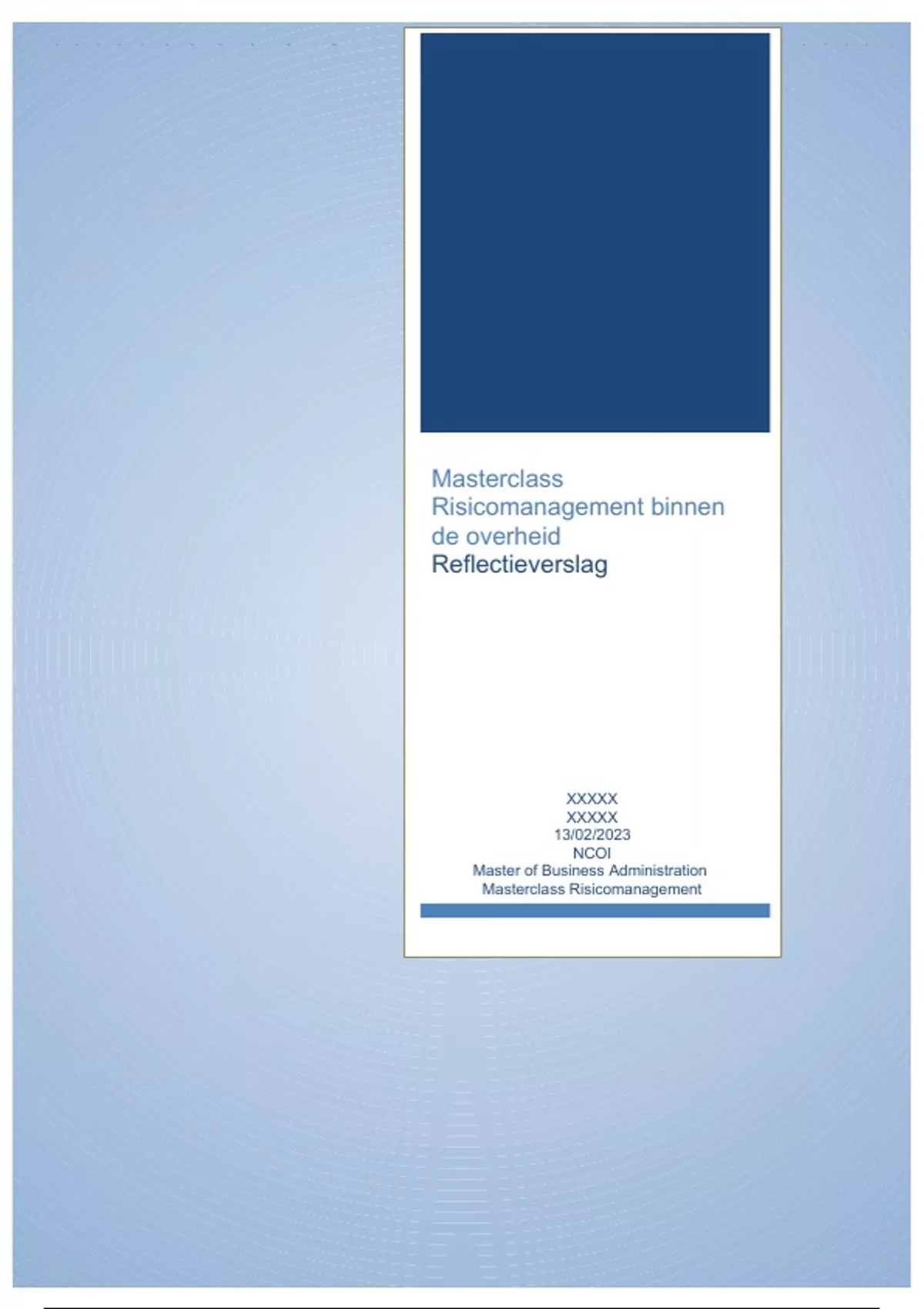 Voor u ligt de eindopdracht voor de masterclass Risicomanagement binnen de overheid. Dit