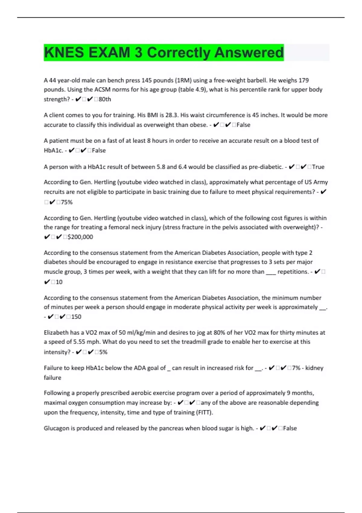 A 44 year-old male can bench press 145 pounds (1RM) using a free-weight barbell. He weighs 179 pounds. Using the ACSM norms for his age group (table 4.9), what is his percentile rank for upper body strength? - ️️80th A client comes to you for training. His BMI is 28.3. His waist circumference is 45 inches. It would be more accurate to classify this individual as overweight than obese. - ️️False A patient must be on a fast of at least 8 hours in order to receive an accurate result on a blood test of HbA1c. - ️️False A person with a HbA1c result of between 5.8 and 6.4 would be classified as pre-diabetic. - ️️True According to Gen. Hertling (youtube video watched in class), approximately what percentage of US Army recruits are not eligible to participate in basic training due to failure to meet physical requirements? - ️️75% According to Gen. Hertling (youtube video watched in class), which of the following cost figures is within the range for treating a femoral neck injury (stress fracture in the pelvis associated with overweight)? - ️️$200,000 According to the consensus statement from the American Diabetes Association, people with type 2 diabetes should be encouraged to engage in resistance exercise that progresses to 3 sets per major muscle group, 3 times per week, with a weight that they can lift for no more than ___ repetitions. - ️️10 According to the consensus statement from the American Diabetes Association, the minimum number of minutes per week a person should engage in moderate physical activity per week is approximately __. - ️️150 Elizabeth has a VO2 max of 50 ml/kg/min and desires to jog at 80% of her VO2 max for thirty minutes at a speed of 5.55 mph. What do you need to set the treadmill grade to enable her to exercise at this intensity? - ️️5% Failure to keep HbA1c below the ADA goal of _ can result in increased risk for __. - ️️7% - kidney failure Following a properly prescribed aerobic exercise program over a period of approximately 9 months, maximal oxygen consumption may increase by: - ️️any of the above are reasonable depending upon the frequency, intensity, time and type of training (FITT). Glucagon is produced and released by the pancreas when blood sugar is high. - ️️False