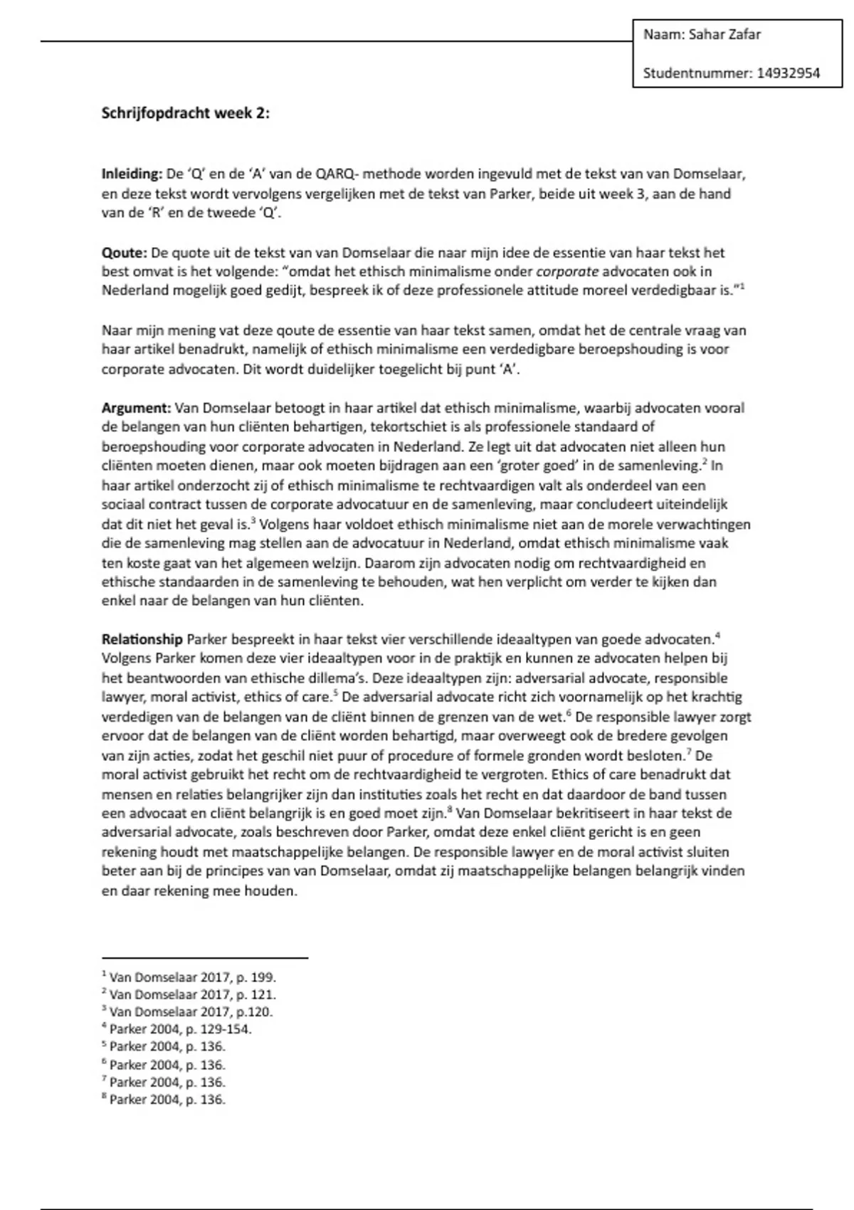 Argument: Van Domselaar betoogt in haar arJkel dat ethisch minimalisme, waarbij advocaten vooral