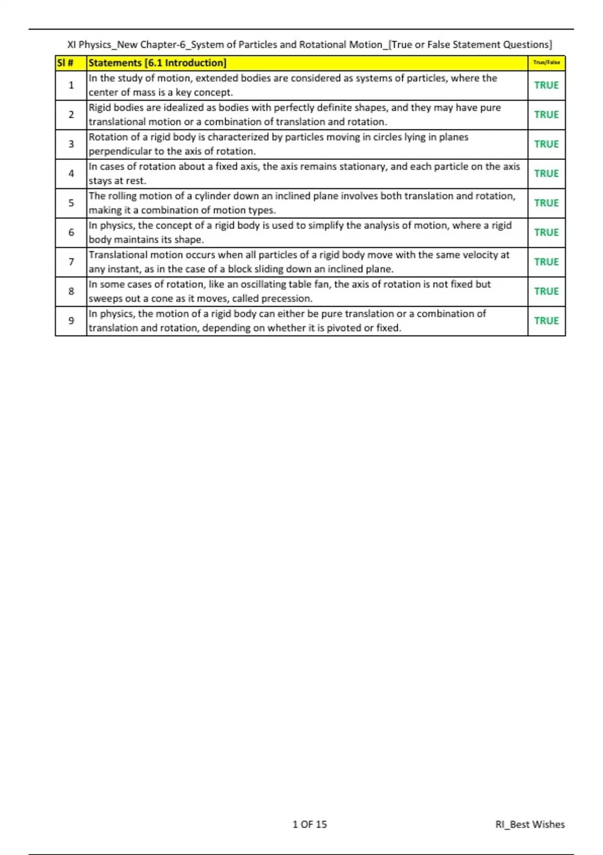 , XI Physics_New Chapter-6_System of Particles and Rotational Motion_[True or False Statement Questions]