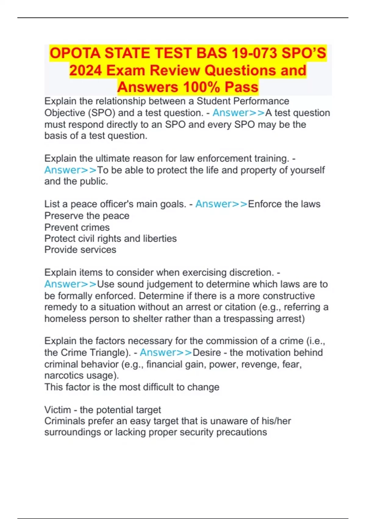 OPOTA STATE TEST BAS 19-073 SPO’S 2024 Exam Review Questions and Answers 100% Pass