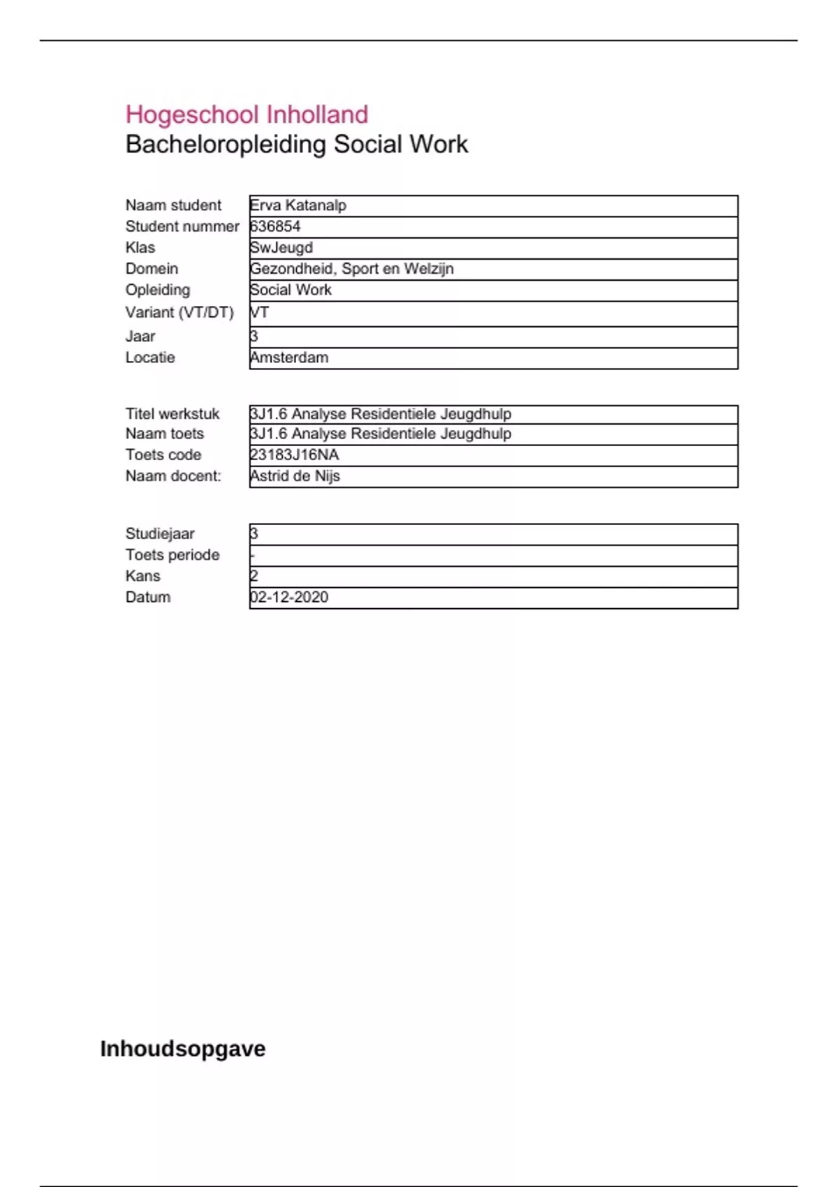 Naam toets 3J1.6 Analyse Residentiele Jeugdhulp