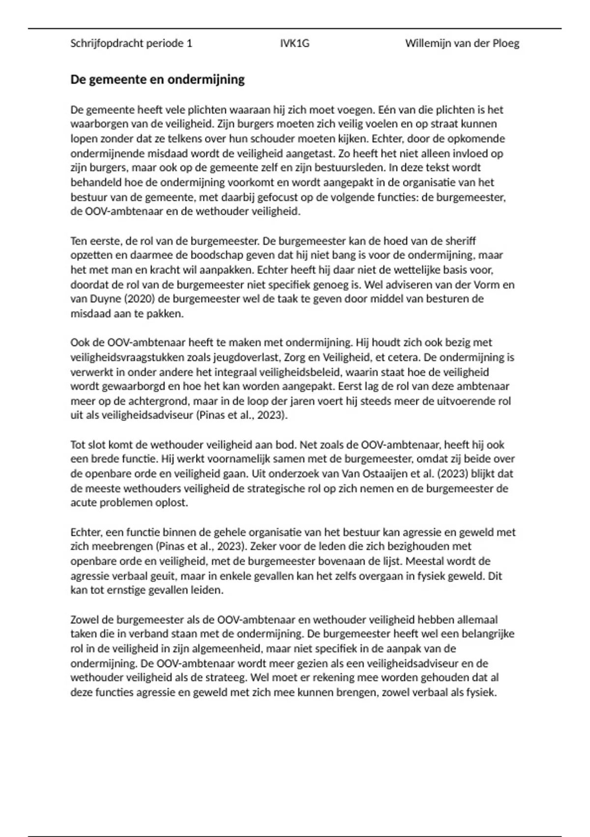 Dit is een opdracht waarbij drie verschillende bronnen van het Tijdschrift voor Veiligheid moesten worden gebruikt om een overkoepelende schrijfopdracht te maken over ondermijning. Agressie en geweld tegen ambtenaren oov, de burgemeester als 'sheriff' in de aanpak van ondermijnende misdaad en openbare orde en veiligheid in het college van burgemeester en wethouders.
