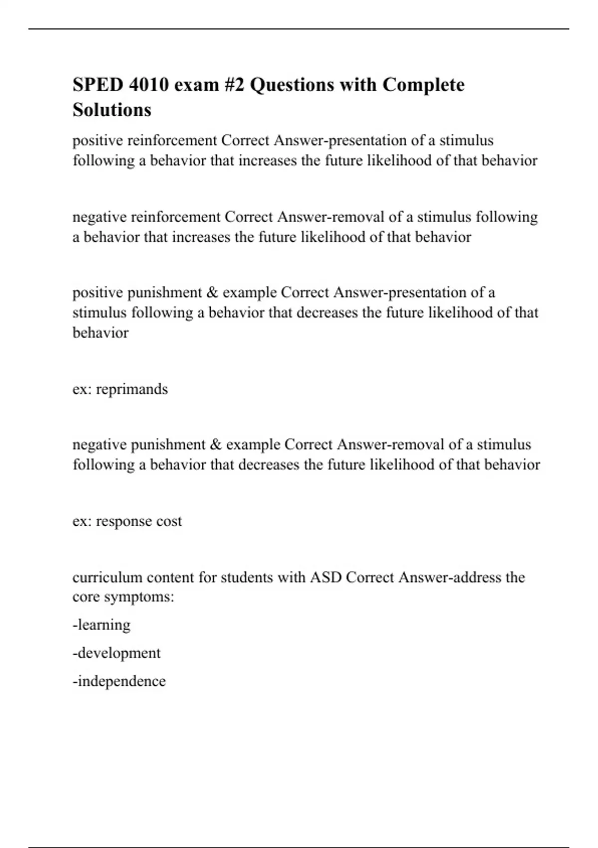 positive reinforcement Correct Answer-presentation of a stimulus following a behavior that increases the future likelihood of that behavior negative reinforcement Correct Answer-removal of a stimulus following a behavior that increases the future likelihood of that behavior positive punishment & example Correct Answer-presentation of a stimulus following a behavior that decreases the future likelihood of that behavior ex: reprimands negative punishment & example Correct Answer-removal of a stimulus following a behavior that decreases the future likelihood of that behavior ex: response cost curriculum content for students with ASD Correct Answer-address the core symptoms: -learning -development -independence