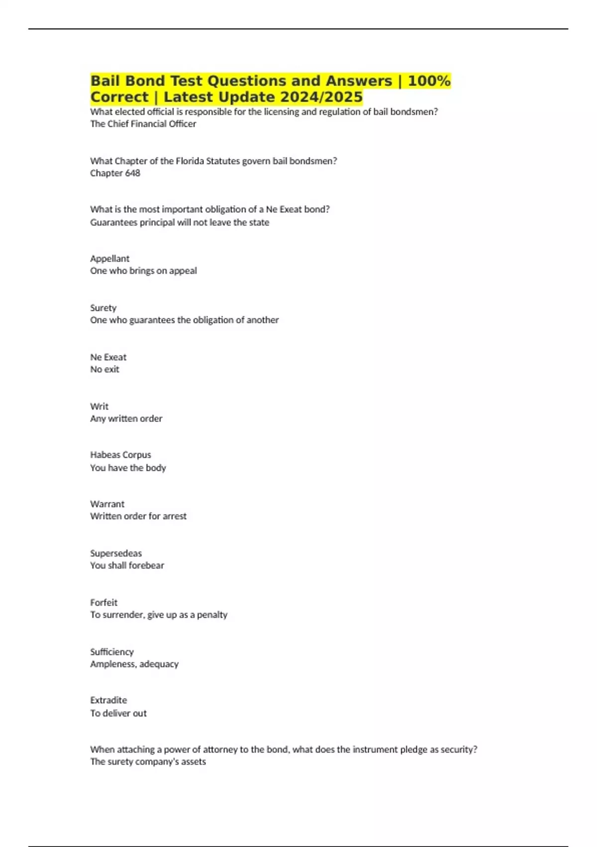 Bail Bond Test Questions and Answers | 100% Correct | Latest Update 2024/2025 What elected official is responsible for the licensing and regulation of bail bondsmen? The Chief Financial Officer What Chapter of the Florida Statutes govern bail bondsmen? Chapter 648 What is the most important obligation of a Ne Exeat bond? Guarantees principal will not leave the state Appellant One who brings on appeal Surety One who guarantees the obligation of another Ne Exeat No exit Writ Any written order Habeas Corpus You have the body Warrant Written order for arrest Supersedeas You shall forebear Forfeit To surrender, give up as a penalty Sufficiency Ampleness, adequacy Extradite To deliver out When attaching a power of attorney to the bond, what does the instrument pledge as security? The surety company's assets What age does an applicant have to attain to become a limited surety in this state? 18 A misdemeanor is crime punishable by what maximum term in jail? Less then 1 year A felony is crime punishable by what term in Jail More than one year to death What is an obligee? A party to a contract that is owed Who is the obligee in a state bail bond? The Governor