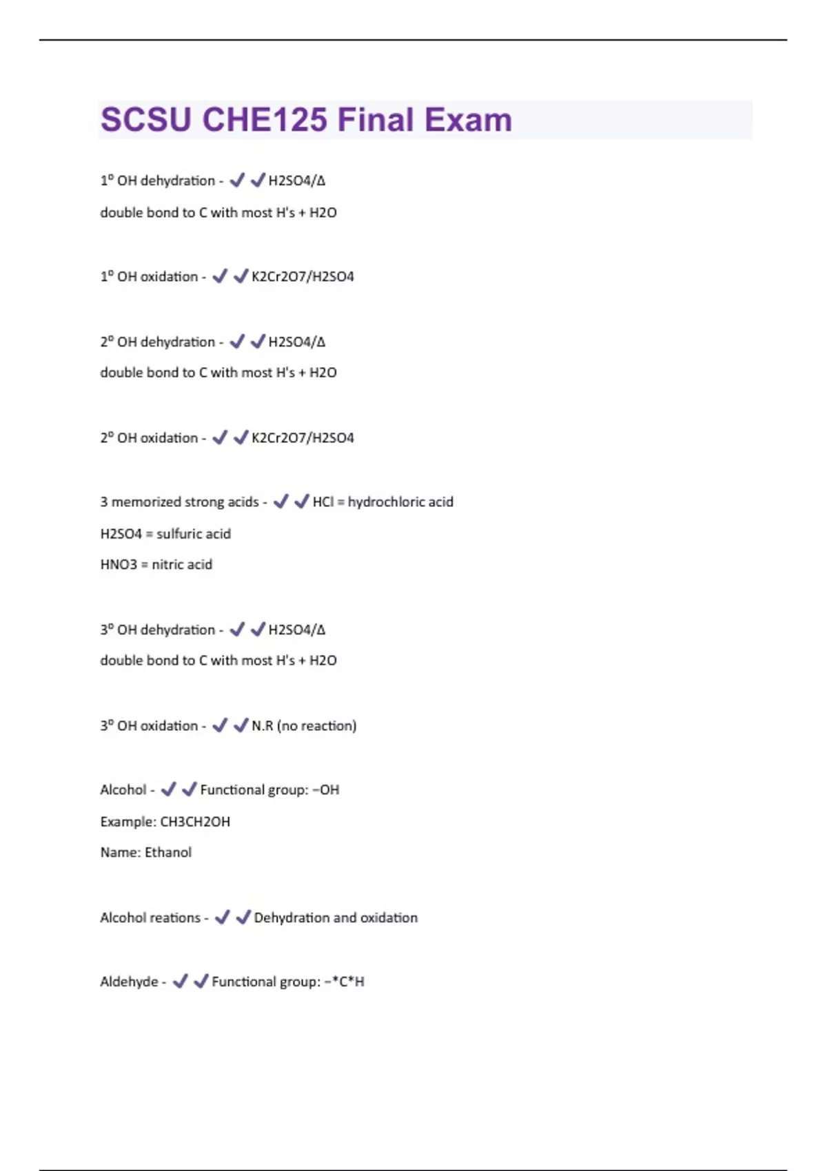 1⁰ OH dehydration - H2SO4/Δ double bond to C with most H's + H2O 1⁰ OH oxidation - K2Cr2O7/H2SO4 2⁰ OH dehydration - H2SO4/Δ double bond to C with most H's + H2O 2⁰ OH oxidation - K2Cr2O7/H2SO4 3 memorized strong acids - HCl = hydrochloric acid H2SO4 = sulfuric acid HNO3 = nitric acid 3⁰ OH dehydration - H2SO4/Δ double bond to C with most H's + H2O 3⁰ OH oxidation - N.R (no reaction) Alcohol - Functional group: −OH Example: CH3CH2OH Name: Ethanol Alcohol reations - Dehydration and oxidation Aldehyde - Functional group: −*C*HExample: CH3CH Name: Ethanal *bold* = double bonded to O Amine - Functional group: −NH2 Example: CH3CH2NH2 Name: Ethanamine Amphiprotic - A substance that can act as either an acid or a base Aniline - C6H5−NH2 *or* C6H7N Benzaldehyde - C6H5−COH *or* C7H6O Benzene - C6H6 Benzoic acid - C6H5−COOH *or* C7H6O2 Butane - C4H10 Butene - H2*CC*H2CH2CH3 *bold* = double bond Butyl - −CH2CH2CH2CH3 Butyne - H3C*CC*CH3 *bold* = triple bondCarboxyl group - −COOH Carboxylic acid - Functional group: −C−OH Example: CH3COH Name: Acetic acid *bold* = double bonded to O Cis - Cyclic ether - Decane - C10H22 Decene - H2*CC*H2CH2CH2CH2CH2CH2CH3 *bold* = double bond Decyne - H3CCH2CH2CH2*CC*CH2CH2CH2CH3 *bold* = triple bond Density of water - 1.0g / mL Depronated form - Conjugate base form Dilution - M1V1 = M2V2 Diprotic acid - Can donate up to 2 protons (H+) Equation when H+ ions are added - H+ + A- → HAEquation when OH- ions are added - OH- + HA → H2O + AEster - Functional group: −*C*−OR Example: CH3COCH2CH3 Name: Ethyl acetate *bold* = double bonded to O Ethane - C2H6 Ethene - H2*CC*H2 *bold* = double bond Ethyl - −CHCH2CH3 Ethyne - H*CC*H *bold* = triple bond Henderson-Hasselbalch equation - pH = pKa + log([A-]/[HA]) HEPES are synthetic amine compounds that are often used to make buffers for biochemical studies. What is the pH of a 1.0 L buffer solution that is 0.250 M HEPES acid form and 0.050 M HEPES base form? pKa for HEPES acid is 7.55. If 10 mL of 1.0 M NaOH is added to the above buffer, what will be the new pH of the buffer? Assume the total volume will be 1010 mL - pH = 7.55 + log(0.050M/0.250M) = 6.85 NaOH + HEPES → H2O + HEPES 0.250 0.050 -0.01 +0.01 0.240 0.060pH = 7.55 + log(0.060M/0.240M) = 6.85 Heptane - C7H16 Heptene - H2*CC*H2CH2CH2CH2CH2CH3 *bold* = double bond Heptyne - H3CCH2*CC*CH2CH2CH3 *bold* = triple bond Hexane - C6H14 Hexene - H2*CC*H2CH2CH2CH2CH3 *bold* = double bond Hexyne - H3CCH2*CC*CH2CH3 *bold* = triple bond How many grams of NaCl are needed to make 250 mL of a 0.90% (w/v) solution? - 2.3g NaCl How to determine if structures are constitutional isomers? - If they have the same molecular formula, they are constitutional isomers How to determine if structures are the same compound - If they have the same name, they are the same compound Hydroxyl group - −OH Isobutyl - −-CH2*CH*CH3