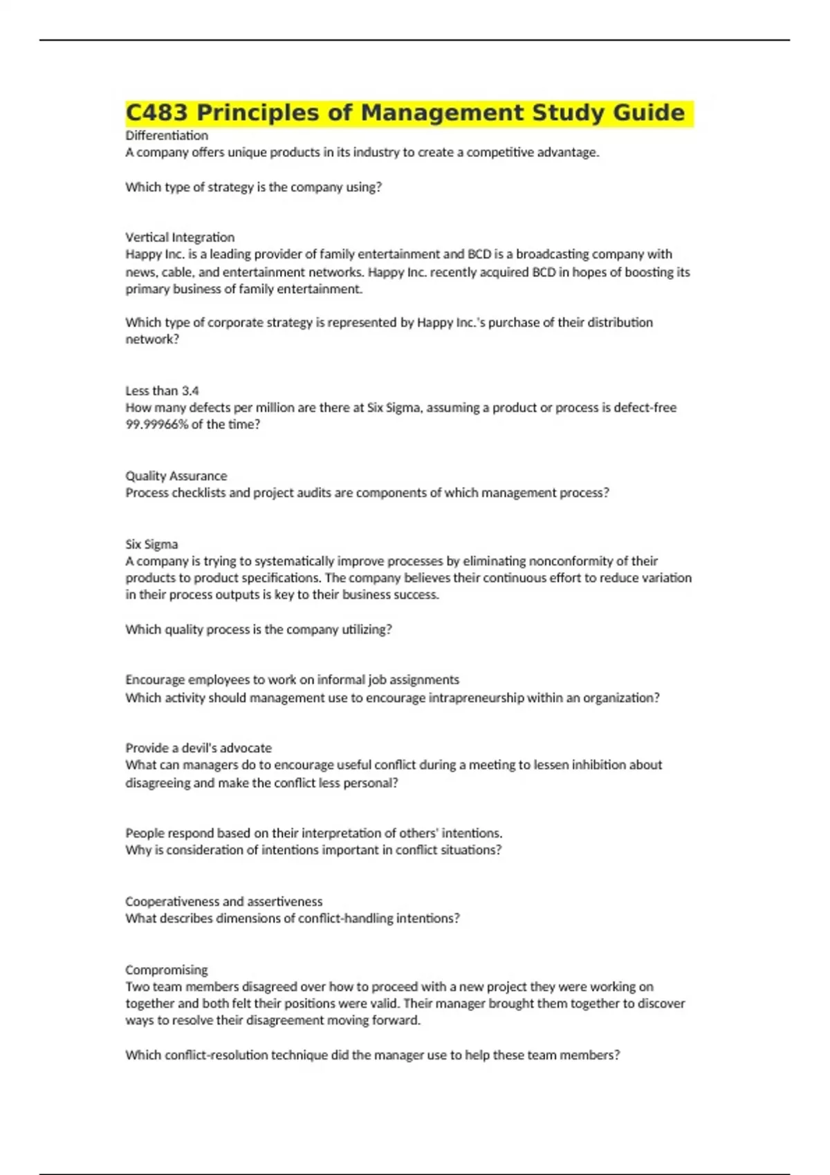 C483 Principles of Management Study Guide Differentiation A company offers unique products in its industry to create a competitive advantage. Which type of strategy is the company using? Vertical Integration Happy Inc. is a leading provider of family entertainment and BCD is a broadcasting company with news, cable, and entertainment networks. Happy Inc. recently acquired BCD in hopes of boosting its primary business of family entertainment. Which type of corporate strategy is represented by Happy Inc.'s purchase of their distribution network? Less than 3.4 How many defects per million are there at Six Sigma, assuming a product or process is defect-free 99.99966% of the time? Quality Assurance Process checklists and project audits are components of which management process? Six Sigma A company is trying to systematically improve processes by eliminating nonconformity of their products to product specifications. The company believes their continuous effort to reduce variation in their process outputs is key to their business success. Which quality process is the company utilizing? Encourage employees to work on informal job assignments Which activity should management use to encourage intrapreneurship within an organization? Provide a devil's advocate What can managers do to encourage useful conflict during a meeting to lessen inhibition about disagreeing and make the conflict less personal? People respond based on their interpretation of others' intentions. Why is consideration of intentions important in conflict situations? Cooperativeness and assertiveness What describes dimensions of conflict-handling intentions? Compromising Two team members disagreed over how to proceed with a new project they were working on together and both felt their positions were valid. Their manager brought them together to discover ways to resolve their disagreement moving forward. Which conflict-resolution technique did the manager use to help these team members? Market control Which type of control system is being implemented when management uses prices, profit centers, and exchange relationships as a control? Taking corrective action What is the fourth step of the control process