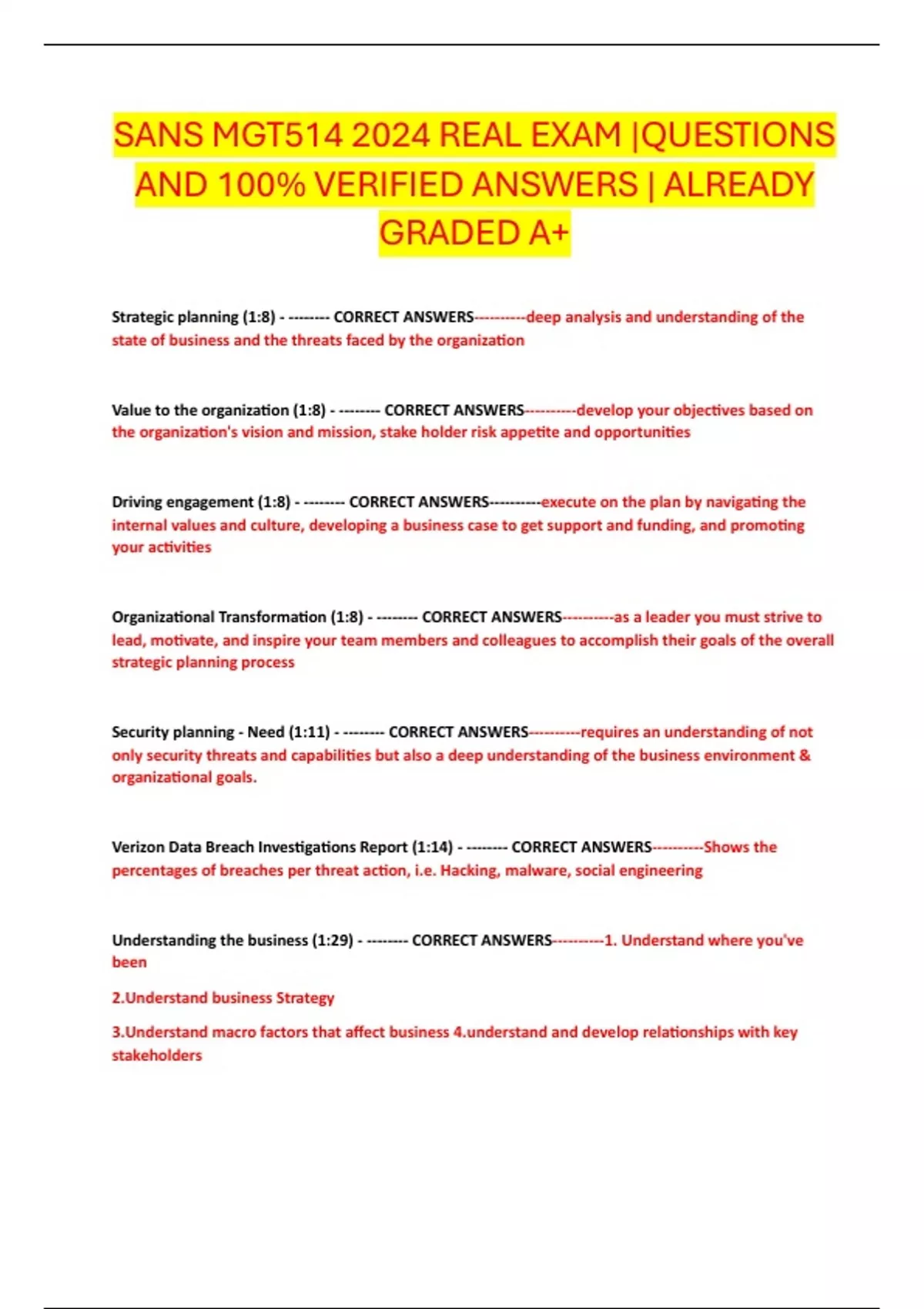 SANS MGT514 2024 REAL EXAM |QUESTIONS AND 100% VERIFIED ANSWERS | ALREADY GRADED A+