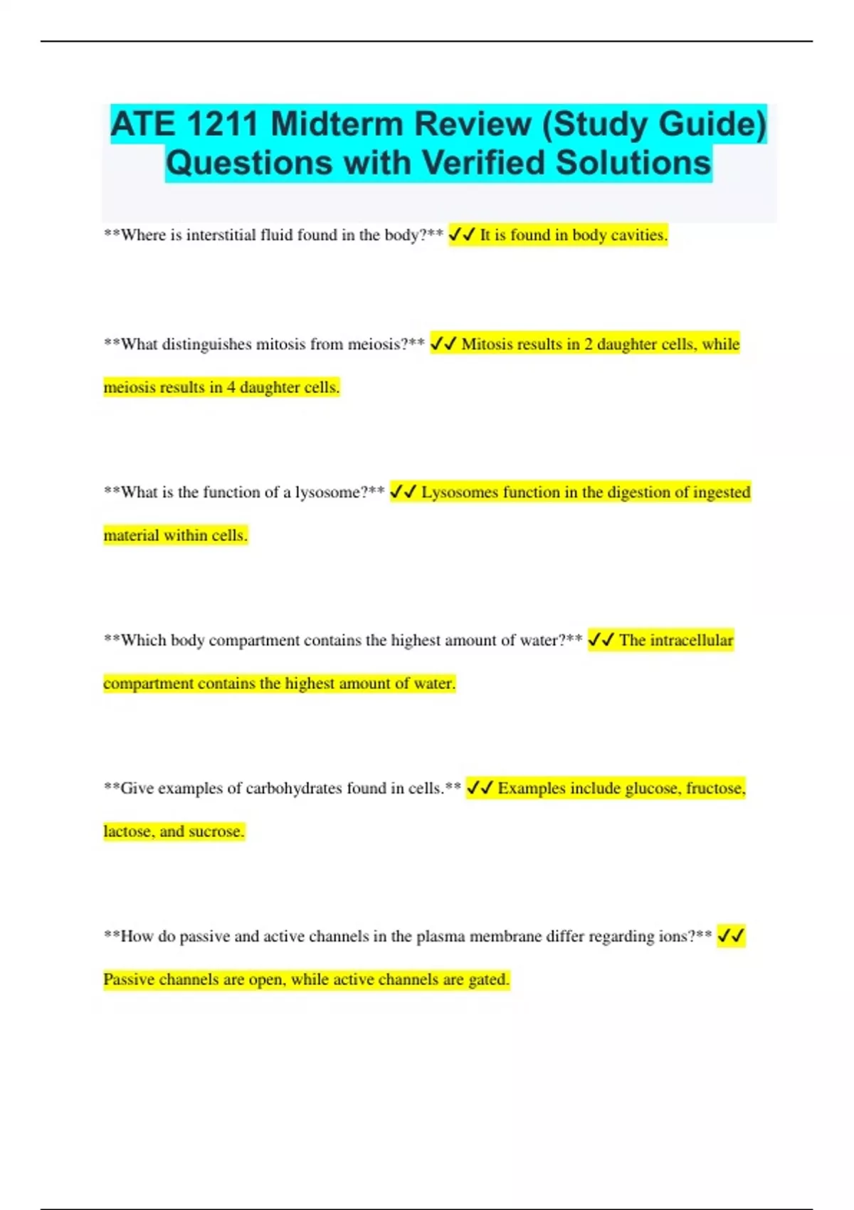 ATE 1211 Midterm Review (Study Guide) Questions with Verified Solutions **Where is interstitial fluid found in the body?** It is found in body cavities. **What distinguishes mitosis from meiosis?** Mitosis results in 2 daughter cells, while meiosis results in 4 daughter cells. **What is the function of a lysosome?** Lysosomes function in the digestion of ingested material within cells. **Which body compartment contains the highest amount of water?** The intracellular compartment contains the highest amount of water. **Give examples of carbohydrates found in cells.** Examples include glucose, fructose, lactose, and sucrose. **How do passive and active channels in the plasma membrane differ regarding ions?** Passive channels are open, while active channels are gated. **What distinguishes excretion from secretion?** Excretion involves the elimination of waste substances by cells, whereas secretion is the release of useful substances by cells. **What is the primary function of mitochondria?** Mitochondria primarily aid in energy production. **What are the differences between anabolism and catabolism?** Anabolism is a building- up process, whereas catabolism involves breaking down substances. **Which ions are predominantly found outside of cells?** Sodium (Na) and chloride (Cl) ions are found in the greatest amounts outside cells. **Define conjugative protein.** Conjugative proteins are simple proteins combined with a non-protein component. **What type of RNA carries coded information from the nucleus to the ribosome?** Messenger RNA (mRNA) performs this function. **Name three compartments of body fluid (water).** These include intracellular, intravascular, and interstitial compartments. **What is the basic structural unit of a protein?** Amino acids are the basic structural units of proteins. **Define isotonic, hypotonic, and hypertonic solutions based on osmolality.** Isotonic solutions have the same osmolality, hypotonic solutions have lower osmolality, and hypertonic solutions have higher osmolality. **Which cells possess voltage-regulated channels in their plasma membrane?** Nerve cells (neurons) have voltage-regulated channels. **What inorganic substance is found in hemoglobin?** Iron (Fe) is found in hemoglobin. **What is the function of ribosomes?** Ribosomes are involved in protein synthesis. **Define irritability in cellular terms.** Irritability is the property of the cytoplasm that allows a cell to respond to stimuli.