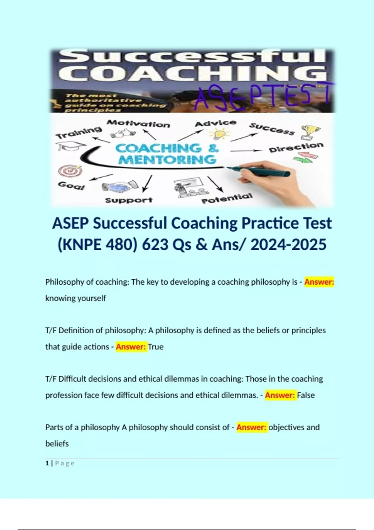 ASEP Successful Coaching Practice Test (KNPE 480) 623 Qs & Ans/ . Terms like: Philosophy of coaching: The key to developing a coaching philosophy is - Answer: knowing yourself T/F Definition of philosophy: A philosophy is defined as the beliefs or principles that guide actions - Answer: True T/F Difficult decisions and ethical dilemmas in coaching: Those in the coaching profession face few difficult decisions and ethical dilemmas. - Answer: False Parts of a philosophy A philosophy should consist of - Answer: objectives and beliefs