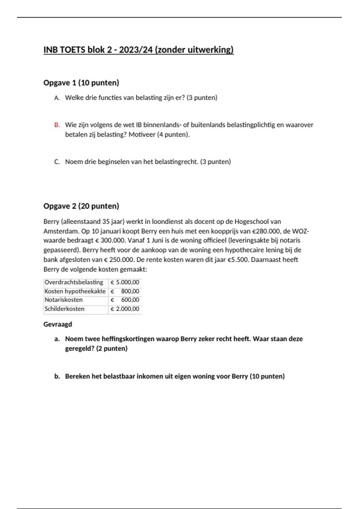 Tentamen (zonder uitwerkingen) Inkomstenbelasting (1000INB_22)