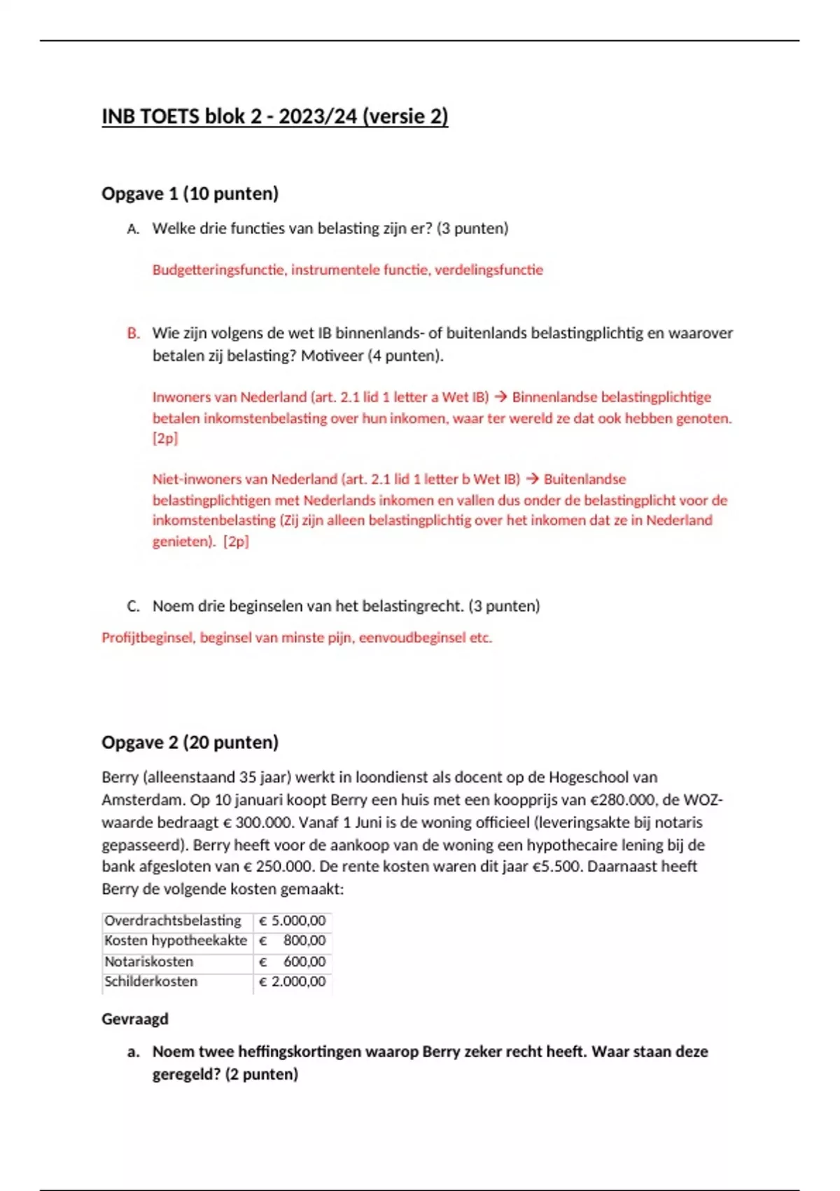 Tentamen (uitwerkingen) Inkomstenbelasting (1000INB_22)